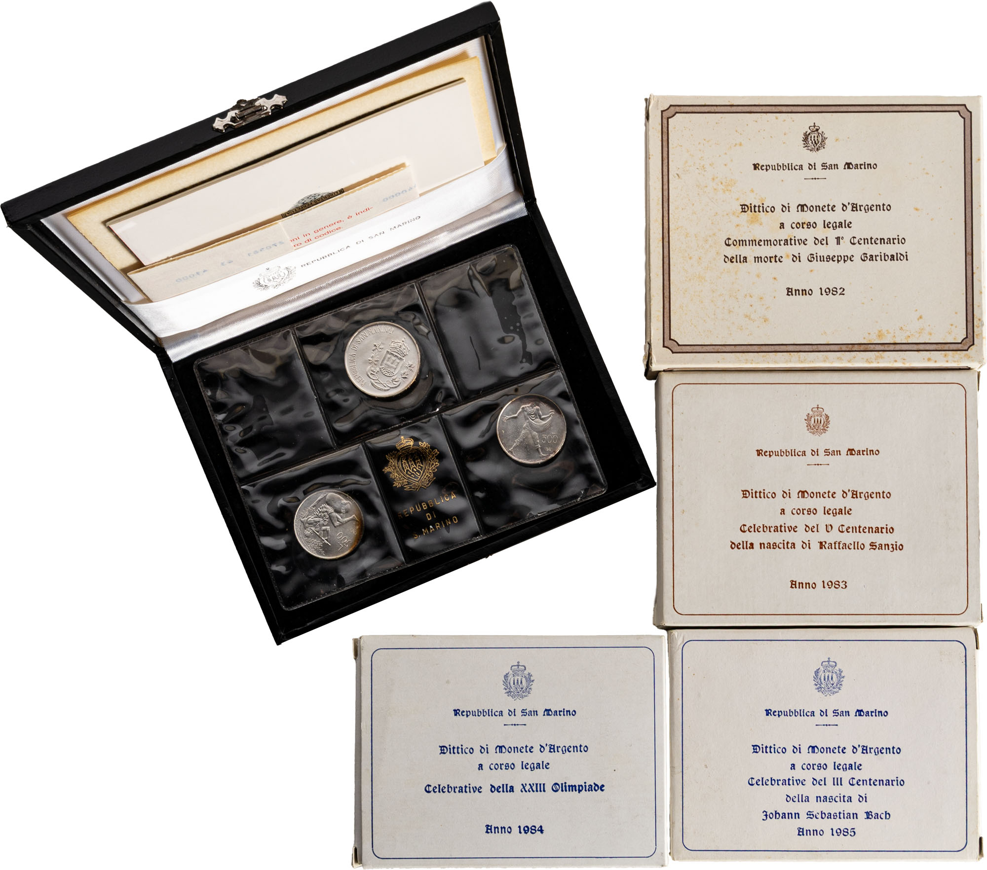 SAN MARINO - Nuova monetazione (1972-) - Lotto di 1 trittico e 4 dittici celebrativi in cofanetto (1981-1985).