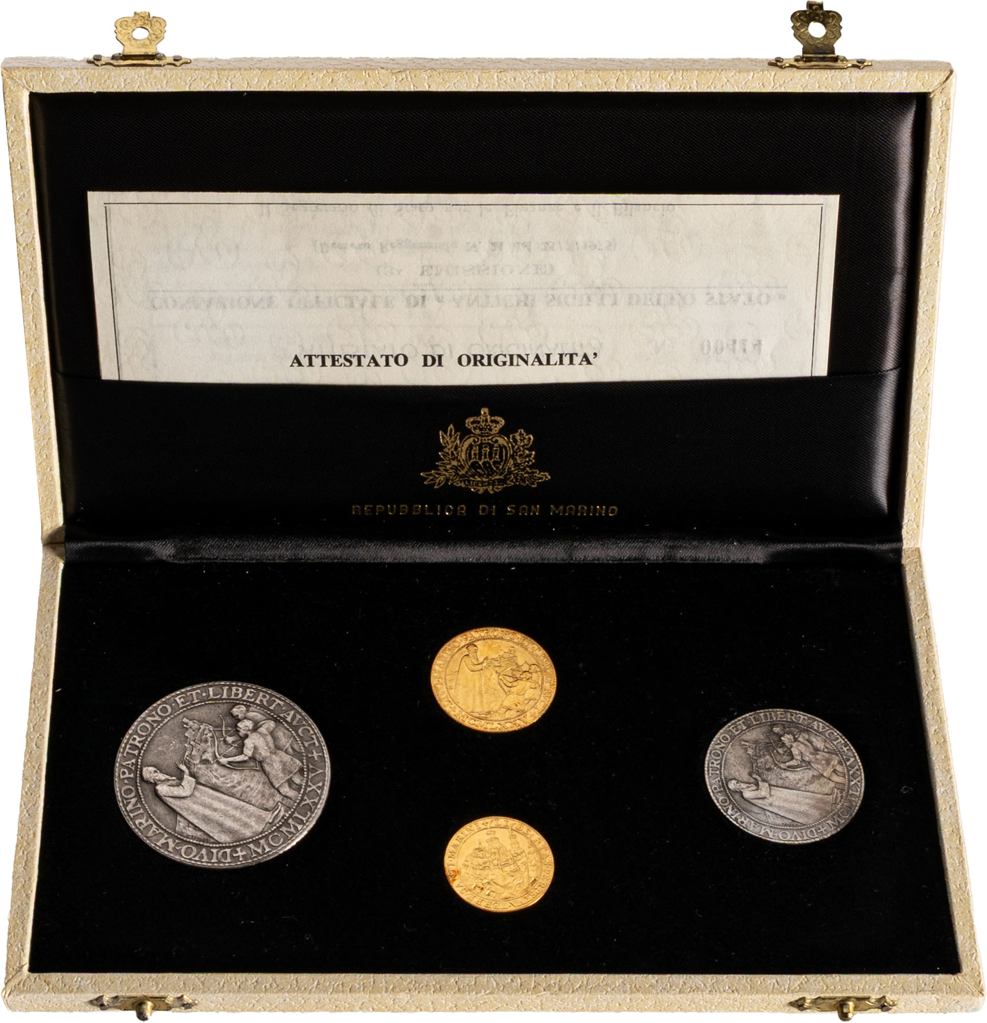 SAN MARINO - Nuova monetazione (1972-) - Cofanetto contenente 4 medaglie 1975, 'Antichi sigilli dello stato'.Vari metalli di cui oro 13,65 gr. e argento 47,10 gr.In elegante cofanetto originale della zecca.FDC