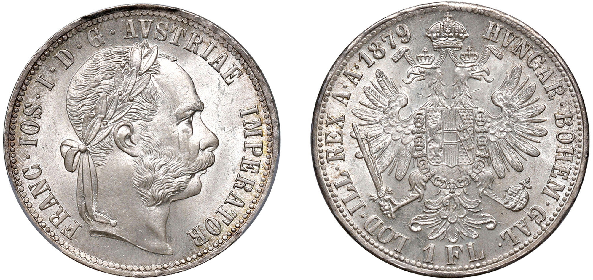 AUSTRIA - FRANCESCO GIUSEPPE D'ASBURGO-LORENA (1848-1916) - Fiorino 1879, Vienna.Argento, n.d.Dritto: Testa laureata a destra; - Rovescio: Aquila bicipite coronata con stemma d'Austria caricato in petto.KM# 2222Bellissimo esemplare dal lustro intenso.Sigillato PCGS MS65Certificato PGCS n. 56918704.