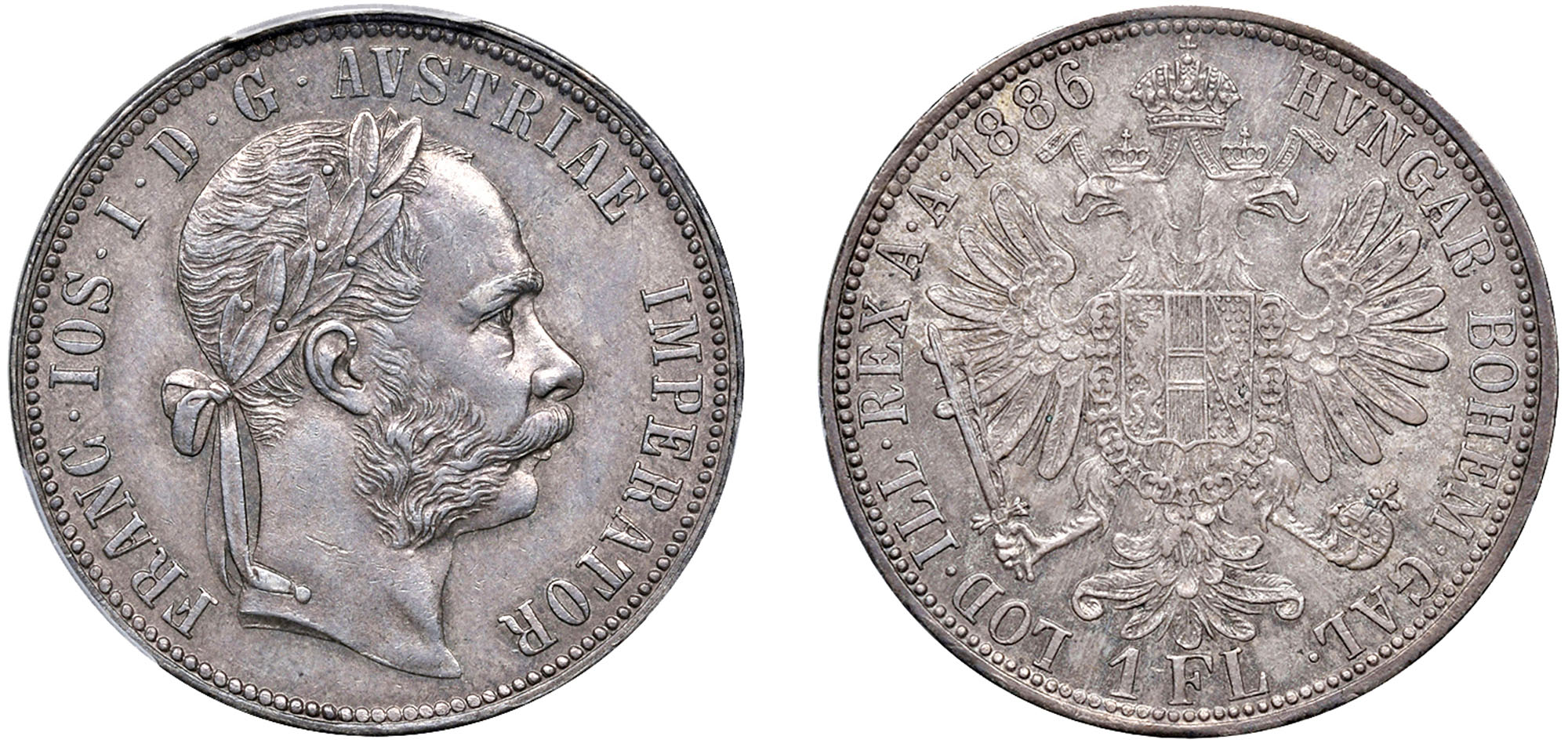AUSTRIA - FRANCESCO GIUSEPPE D'ASBURGO-LORENA (1848-1916) - Fiorino 1886, Vienna.Argento, n.d.Dritto: Testa laureata a destra; - Rovescio: Aquila bicipite coronata con stemma d'Austria caricato in petto.KM# 2222Sigillato PCGS MS62Certificato PGCS n. 56918705.