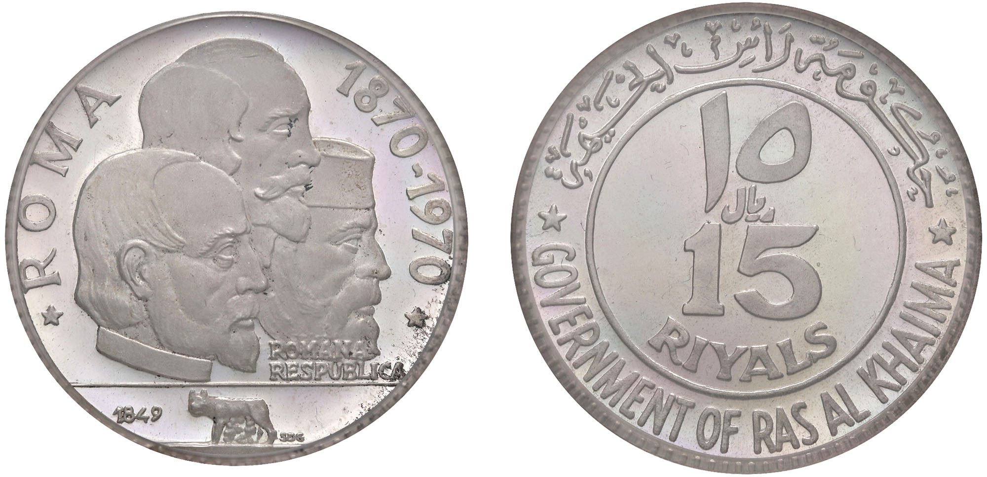 EMIRATI ARABI UNITI - 15 Riyals 1970.Argento, n.d.KM# 19Sigillata PCGS PR67 Deep Cameo.Certificato PCGS n. 50920351.