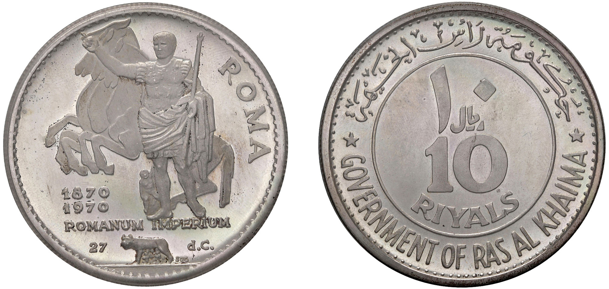 EMIRATI ARABI UNITI - 10 Riyals 1970.Argento, n.d.KM# 18Sigillata PCGS PR67 Deep Cameo.Certificato PCGS n. 50920352.