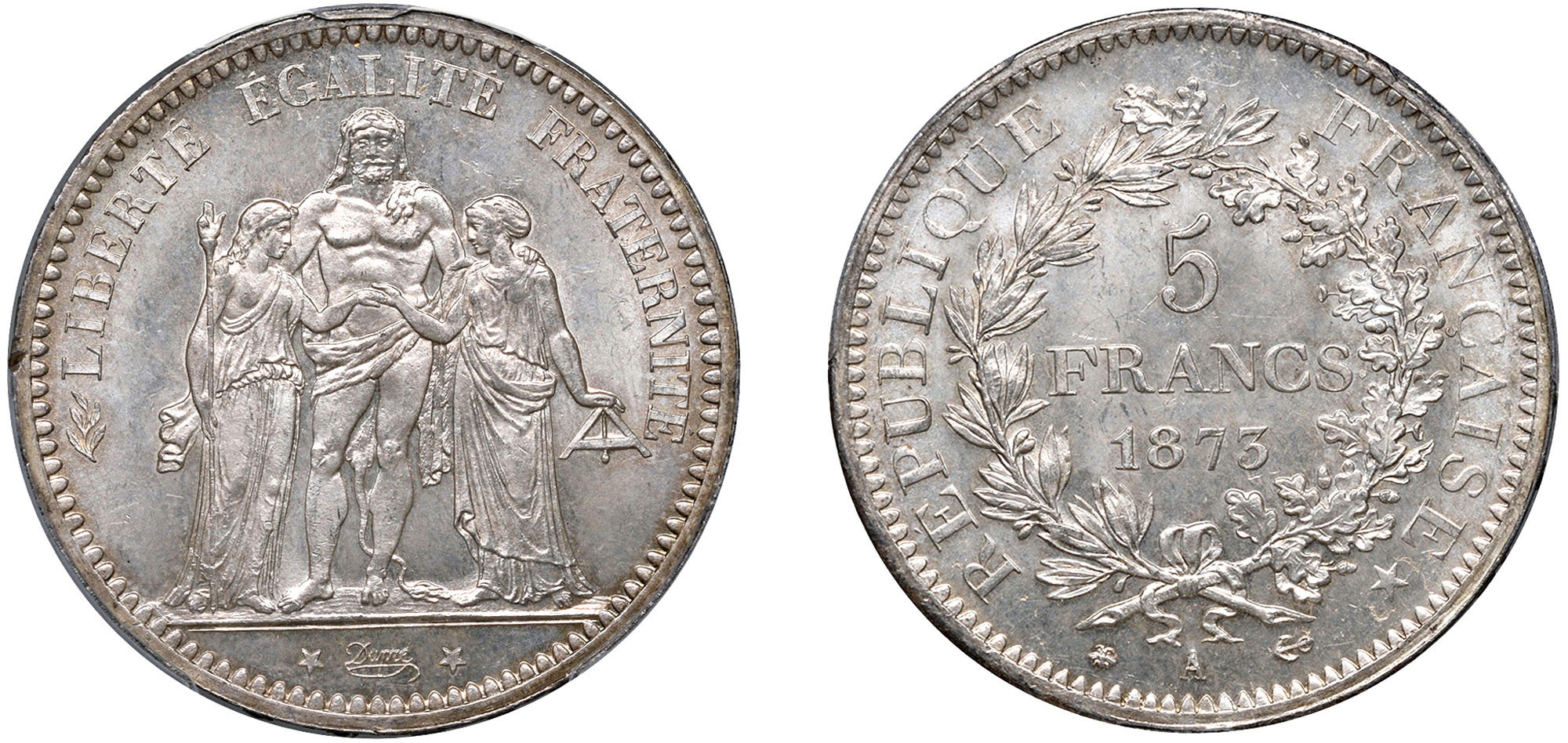 FRANCIA - TERZA REPUBBLICA (1871-1940) - 5 franchi 1873, Parigi.Argento, n.d.Dritto: Ercole con due figure stanti di fronte; - Rovescio: Valore tra rami di alloro e quercia.KM# 52.1Esemplare in stato zecca.Sigillato PCGS MS65.Certificato PCGS n. 56918699.