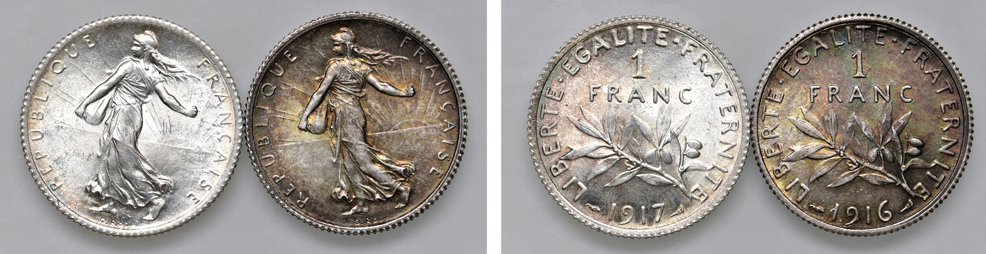 FRANCIA - TERZA REPUBBLICA (1871-1940) - Lotto due esemplari 1 franco 1916 e 1917, Parigi.Argento, 10,00 gr.Dritto: Allegoria della Francia che semina; - Rovescio: Valore sopra ramo di ulivo.KM# 844.1Bella patina.FDC