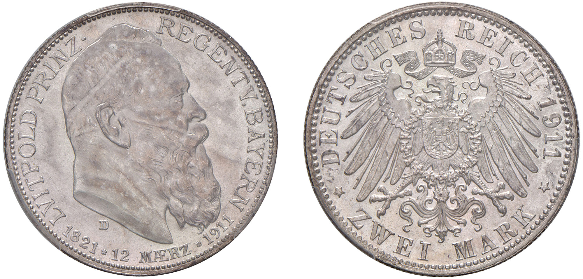 GERMANIA - BAVIERA - PRINCIPE REGGENTE LUITPOLD (1886-1912) - 2 Marchi 1911, Monaco.