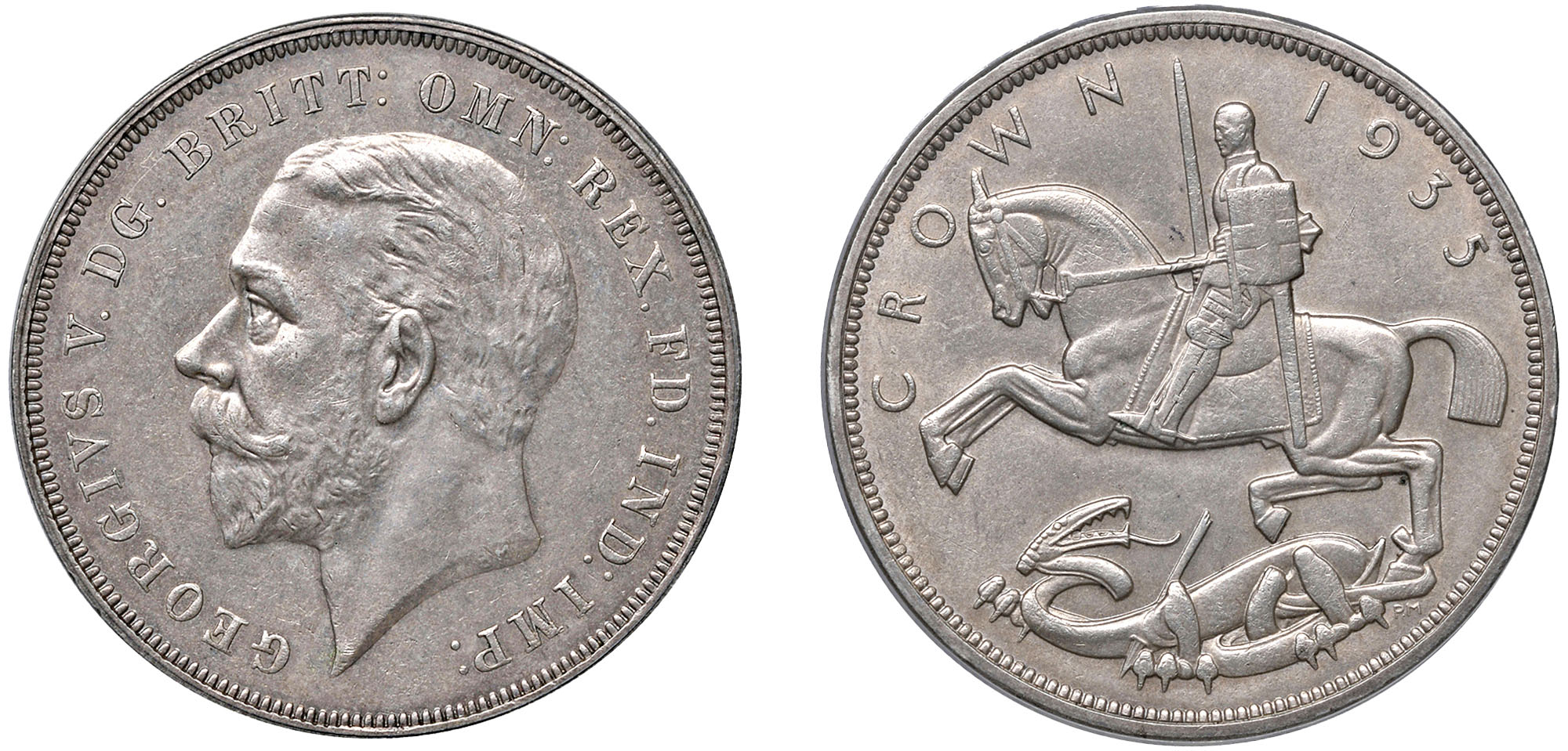 GRAN BRETAGNA - GIORGIO V (1911-1936) - Corona, 1935.Argento, n.d.Dritto: Testa nuda a sinistra; - Rovescio: Drago trafitto sormontato da San Giorgio a cavallo.KM# 842Sigillato PCGS MS62.Certificato PCGS n. 56918702.