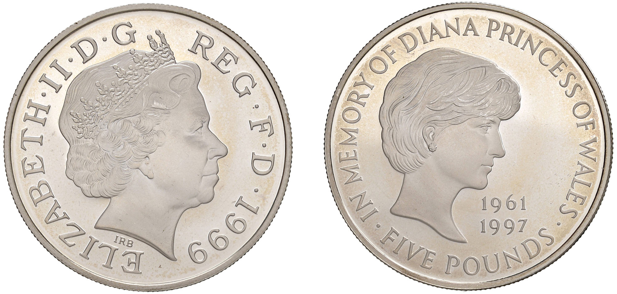 GRAN BRETAGNA - ELISABETTA II (1952-2022) - 5 Pounds 1999.Argento, 28,26 gr.Dritto: Testa coronata a destra; - Rovescio: Testa nuda a destra di Lady Diana.KM#9 97aFDC/FS