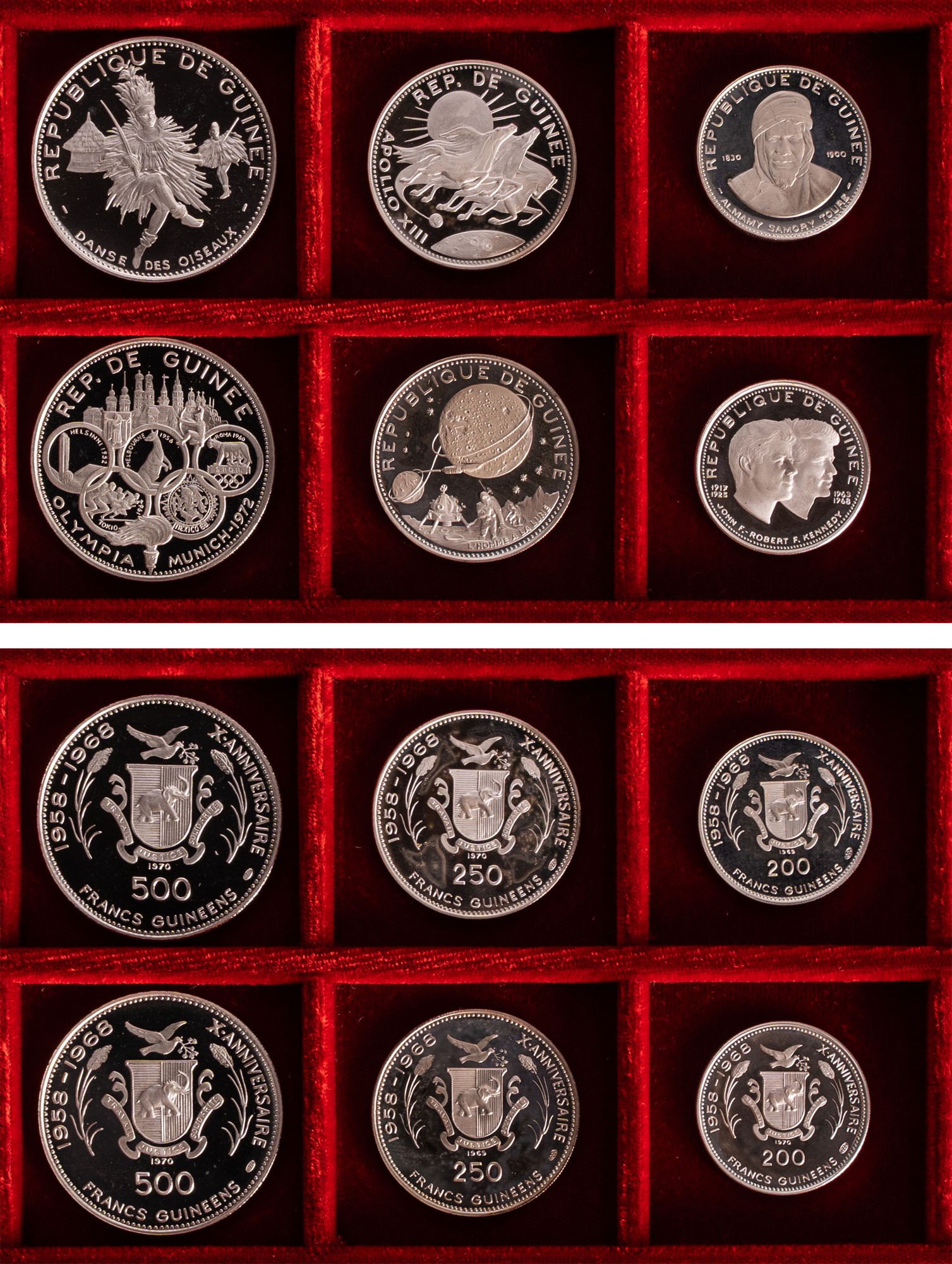 GUINEA - REPUBBLICA - Due serie di 3 valori (200, 250, 500 Franchi), 1968, PROOF.Argento, 110,19 gr.KM# 10, 11, 12, 14, 15, 16.FDC/FS