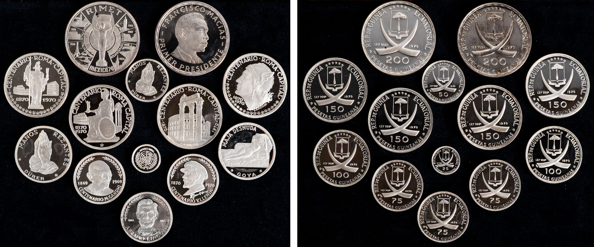GUINEA EQUATORIALE - Lotto 14 monete.Argento, 332,21 gr.KM# 5, 7, 9.1, 10.1, 11, 12.1, 13.5, 14, 15, 16, 17, 18.1, 19.FDC/FS
