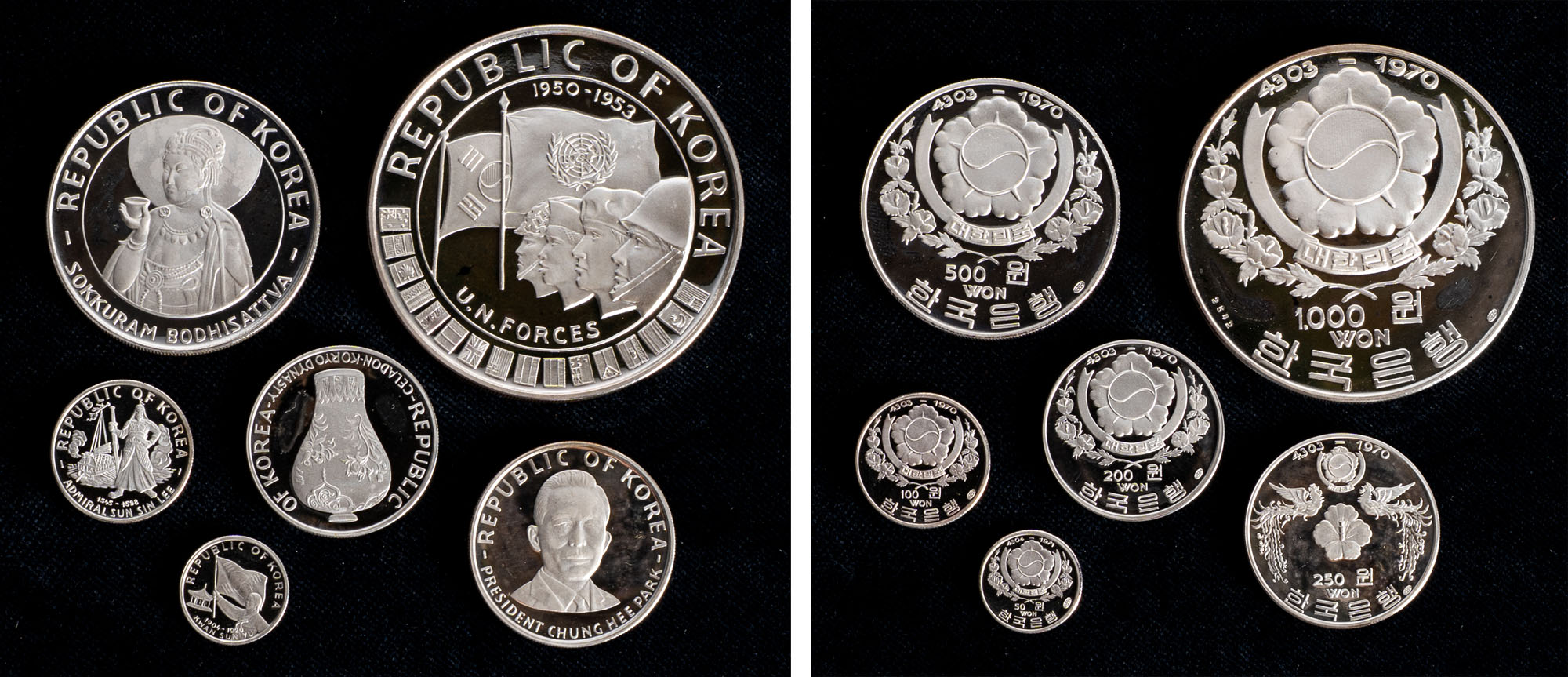 KOREA - Serie 6 valori (50, 100, 200, 250, 500, 1000 Won) 1970, PROOF.Argento, 118,26 gr.KM# 7, 8, 10, 11, 12 e 13FDC/FS
