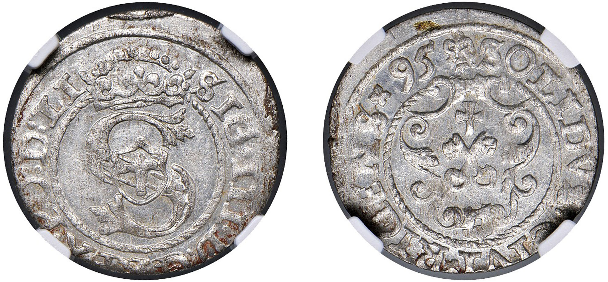 POLONIA - SIGISMONDO III VASA (1587-1632) - Schilling 1595, LI, Riga.Argento, n.d.Haljak 1062Esemplare di eccezionale conservazione per il tipo di moneta.Sigillato NGC MS63.Certificato NGC n. 6881097-015.