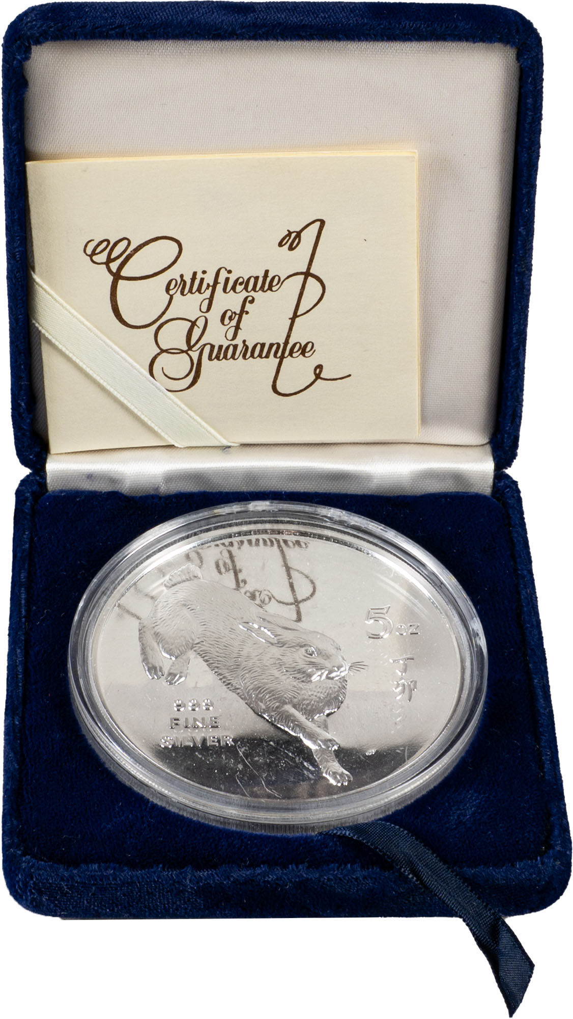 SINGAPORE - 5 Once, 1987, in cofanetto.Argento, 155,50 gr.Completo di cofanetto originale e certificato di autenticità.Segnaliamo vari graffietti sull'oblò.FDC/FS