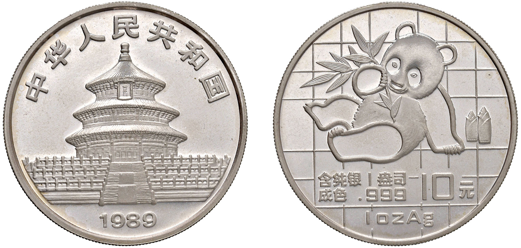 CINA - Repubblica Popolare (1949-) - 10 Yuan da 1 oncia, Serie Panda Proof, 1989.