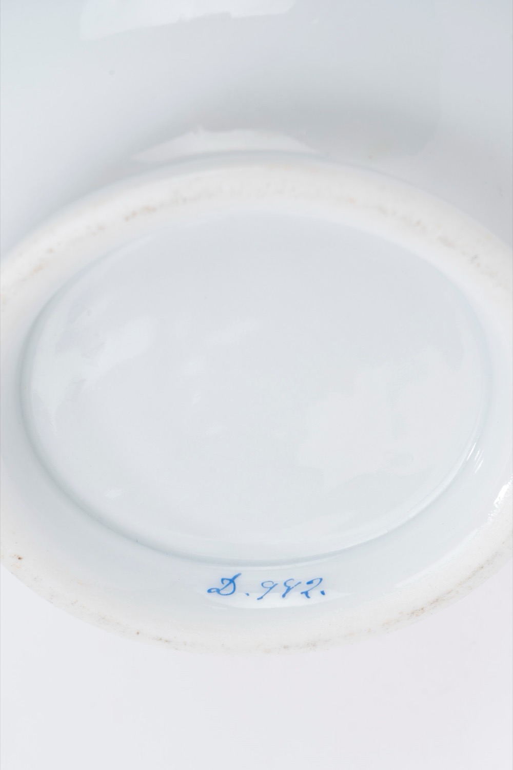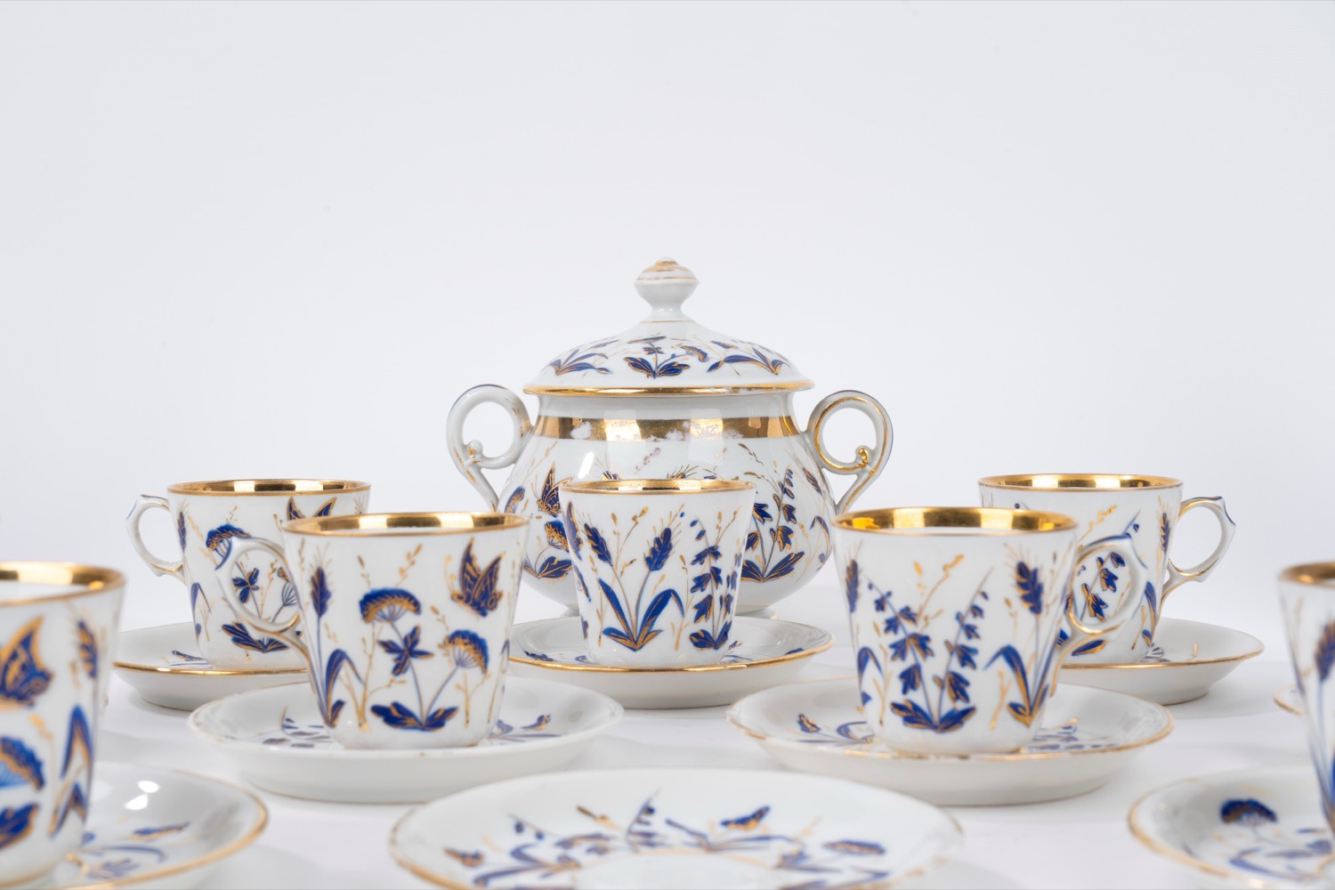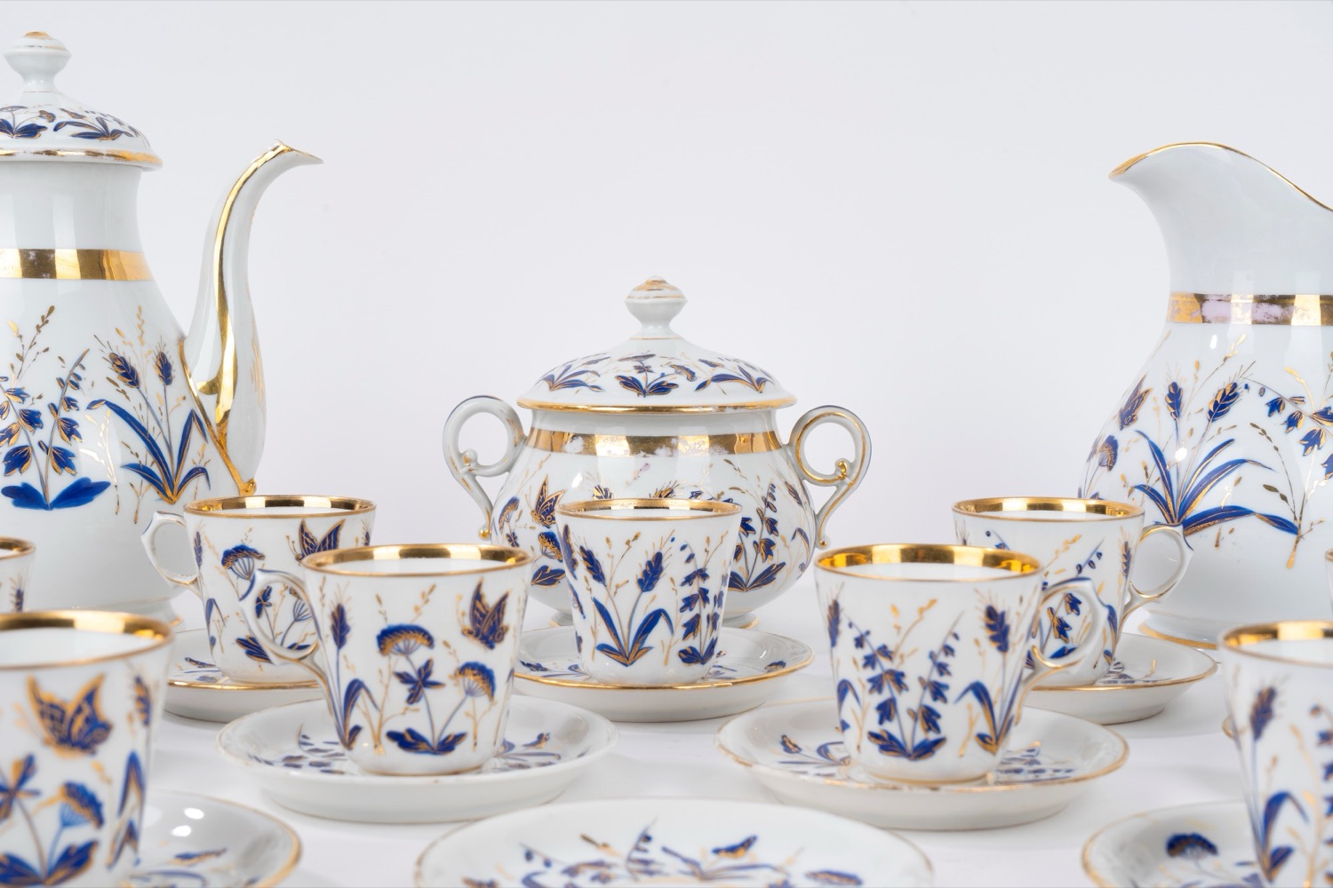 Servizio in porcellana bianca con decori blu e oro, inizi secolo XX