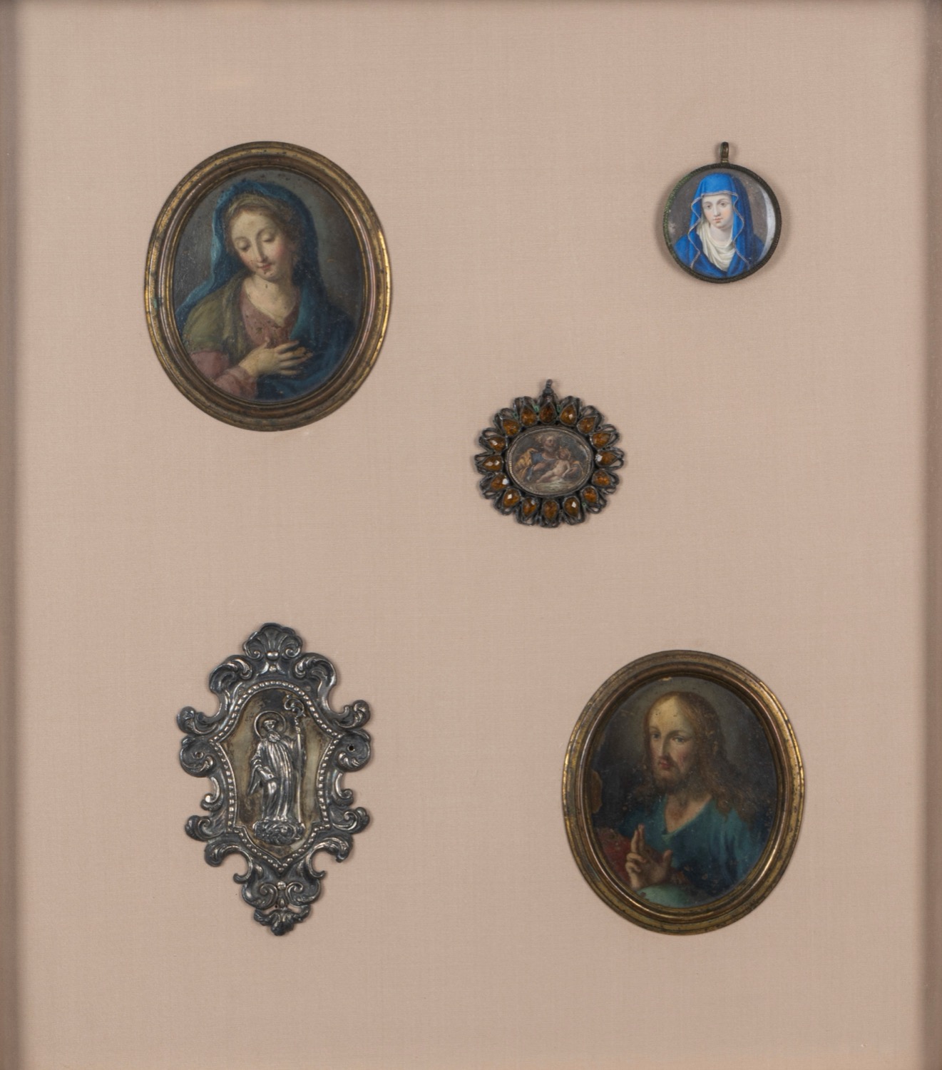 le miniature su rame, di cui due raffiguranti la Vergine, una raffigurante Cristo benedicente e una San Giuseppe con il Bambino; la placca in argento sbalzato raffigurante Santo Vescovo
