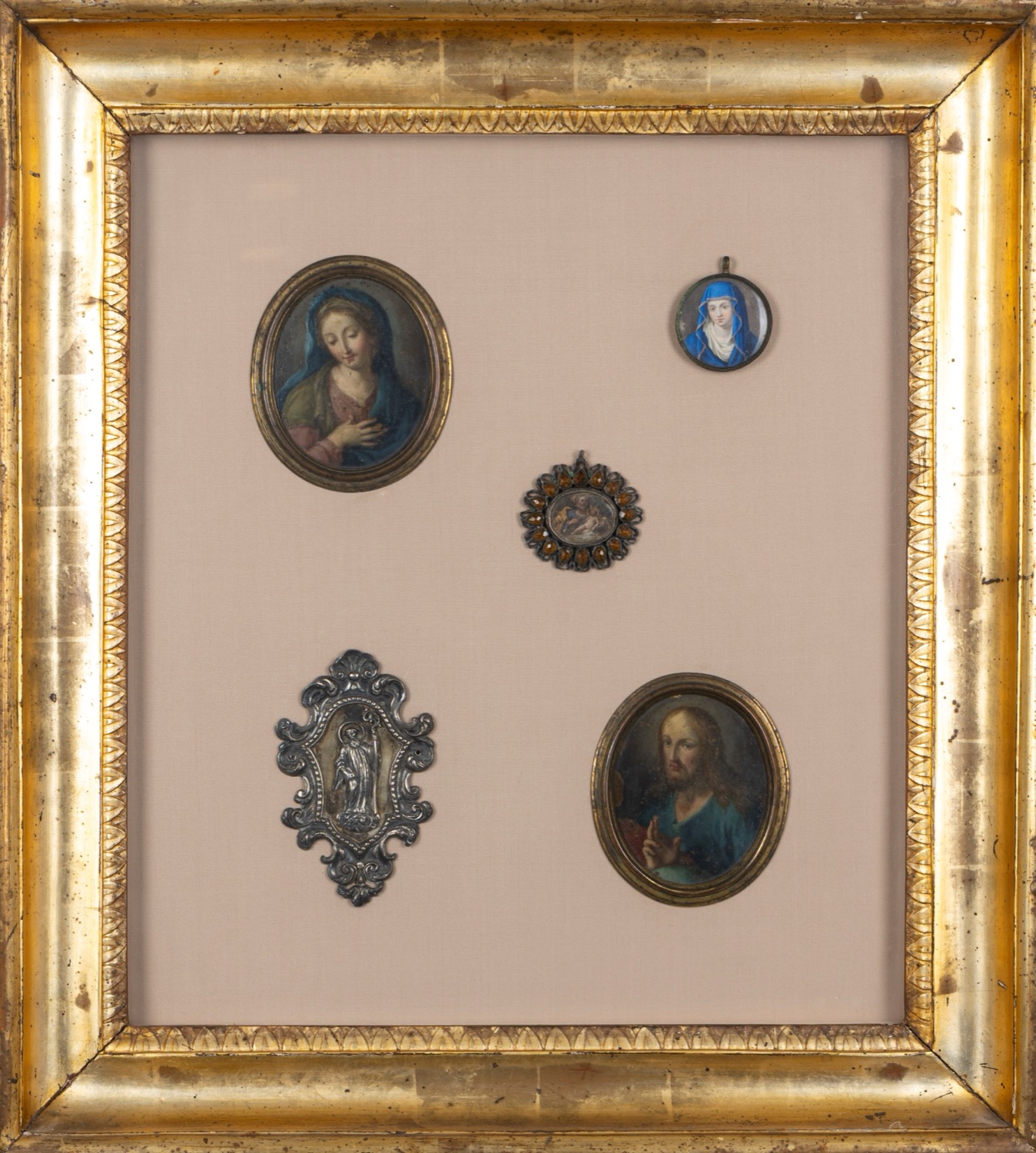 la cornice a guantiera decorata a palmettele miniature su rame, di cui due raffiguranti la Vergine, una raffigurante Cristo benedicente e una San Giuseppe con il Bambino; la placca in argento sbalzato raffigurante Santo Vescovo