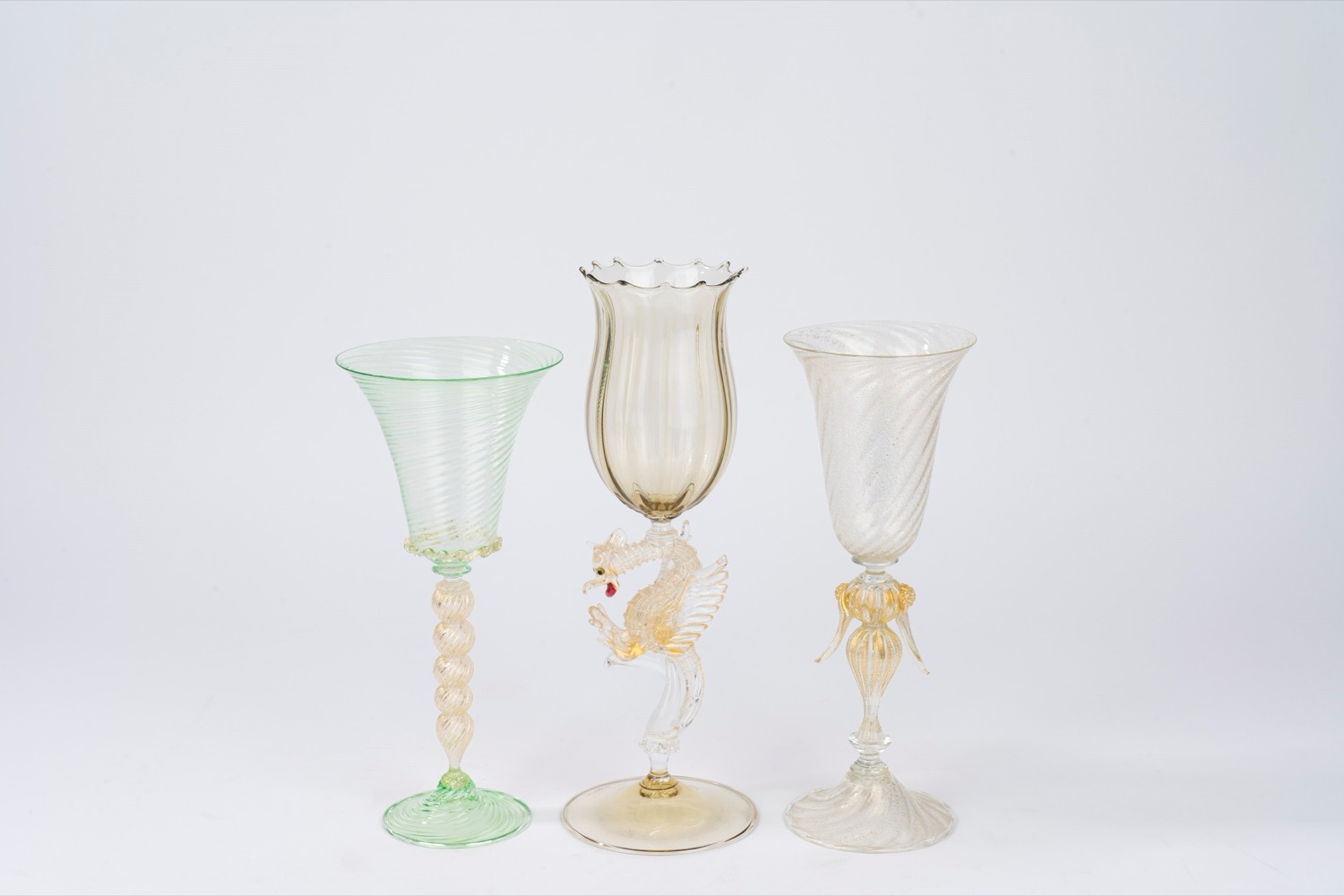 quello firmato Seguso con drago sul fusto, uno ad avventurina e uno color verdequello firmato Seguso con drago sul fusto, uno ad avventurina e uno color verde