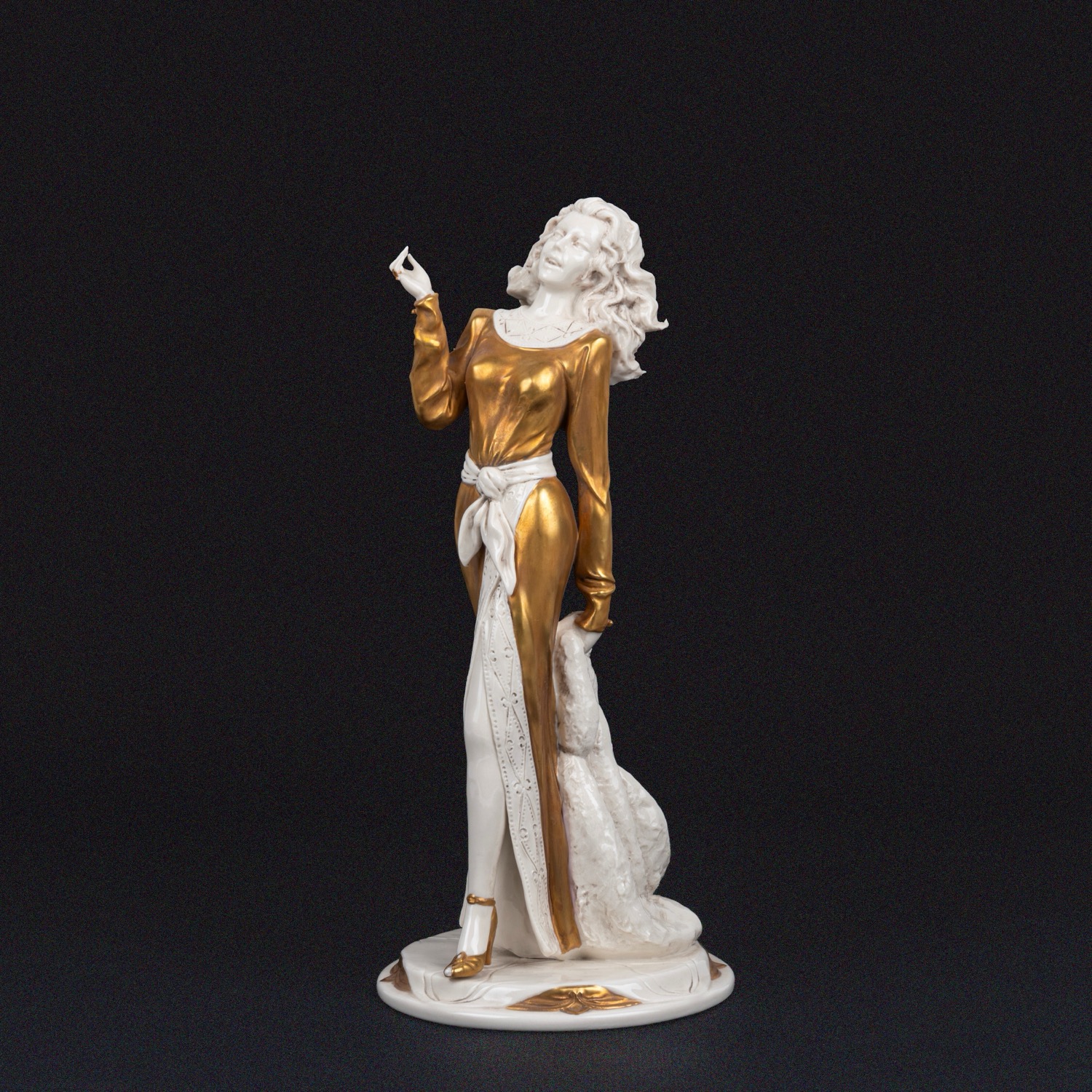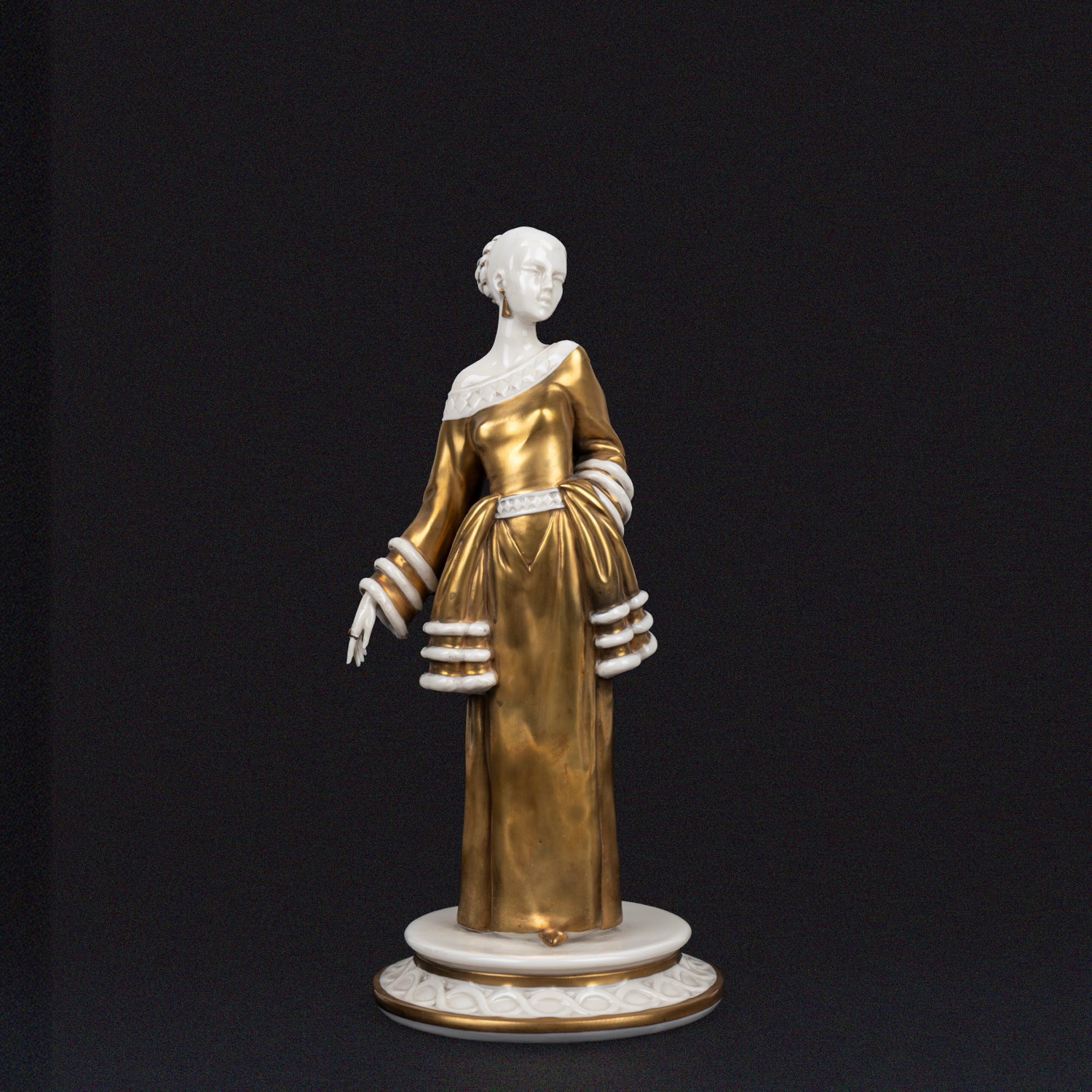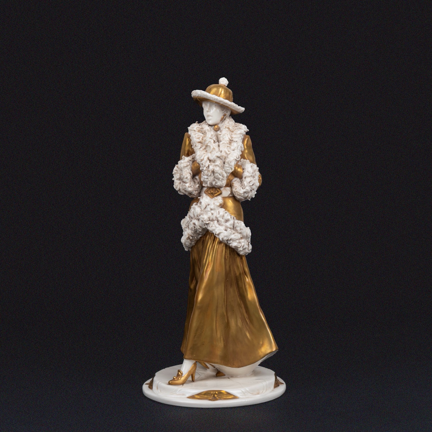 Lotto composto da sette sculture in porcellana di Capodimonte bianca e oro, raffiguranti damine