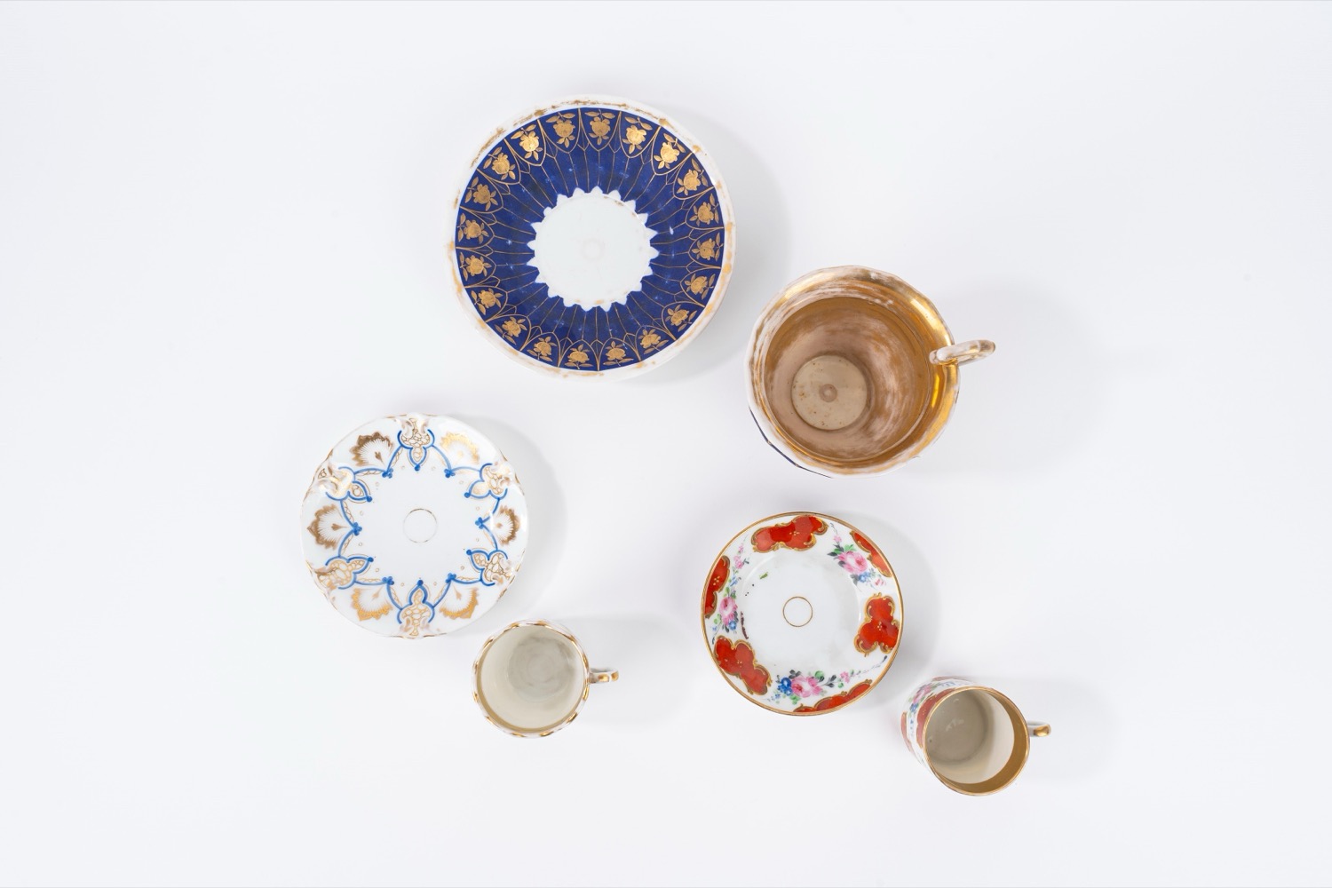 Lotto di tre tazze in porcellana policroma, con piattino, secolo XIX