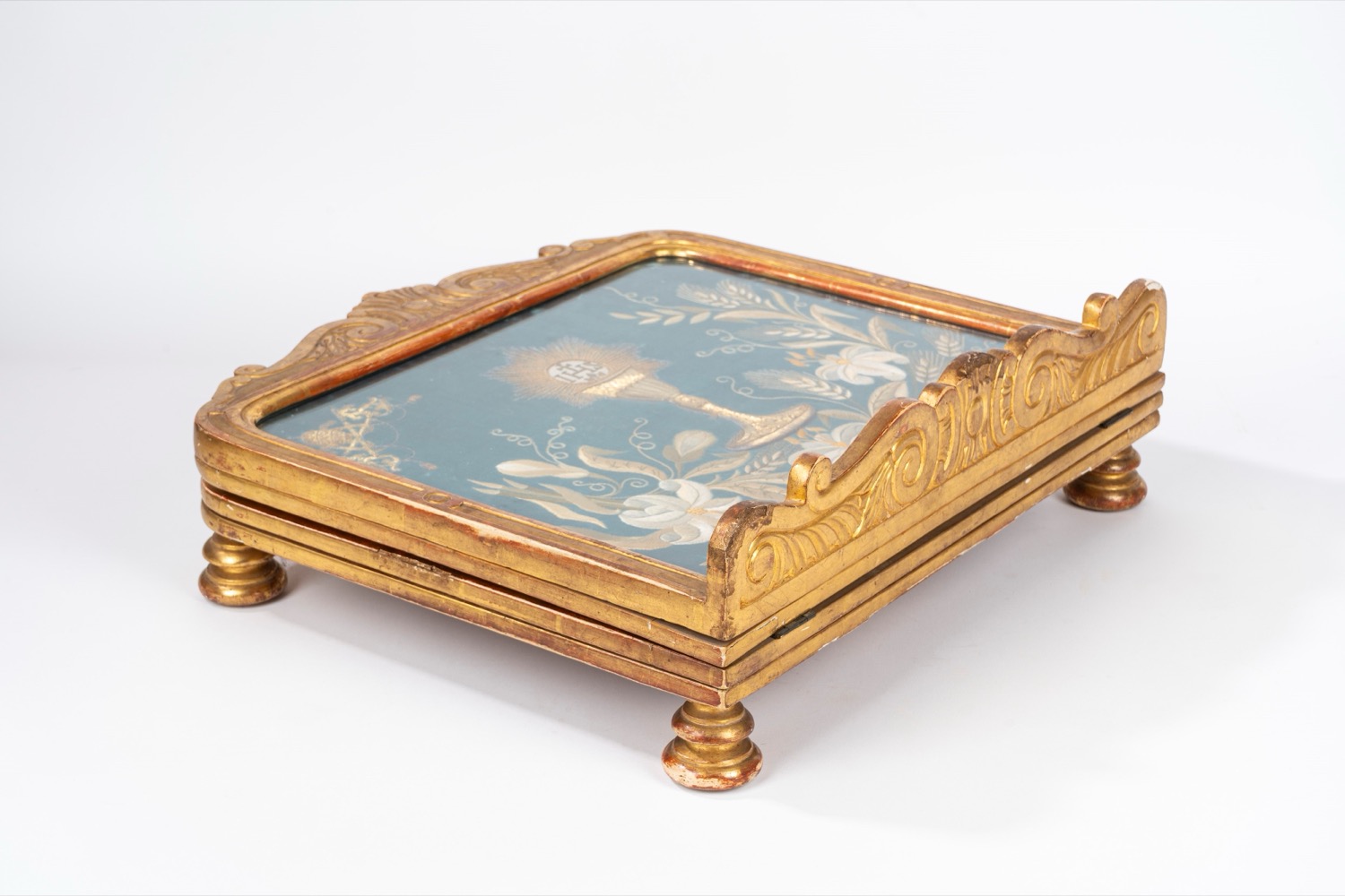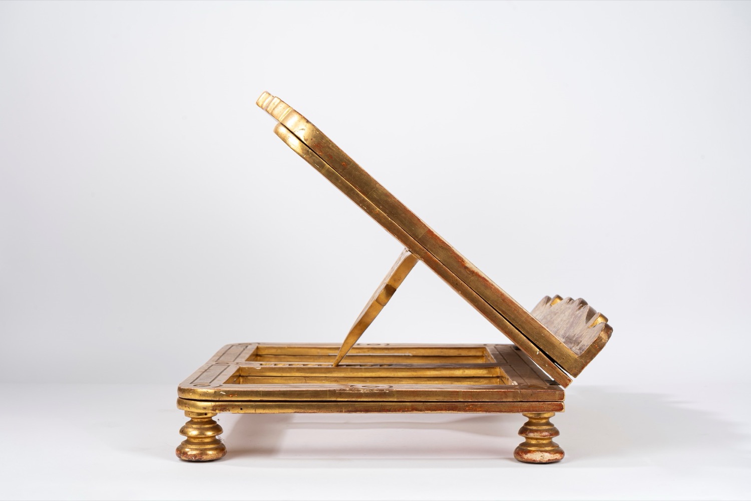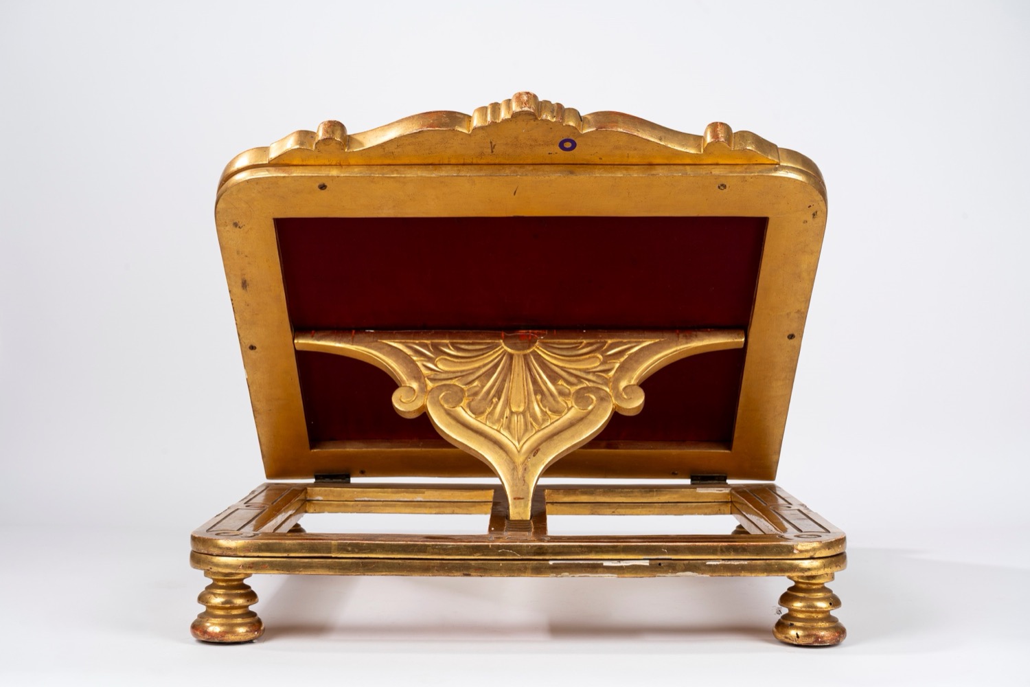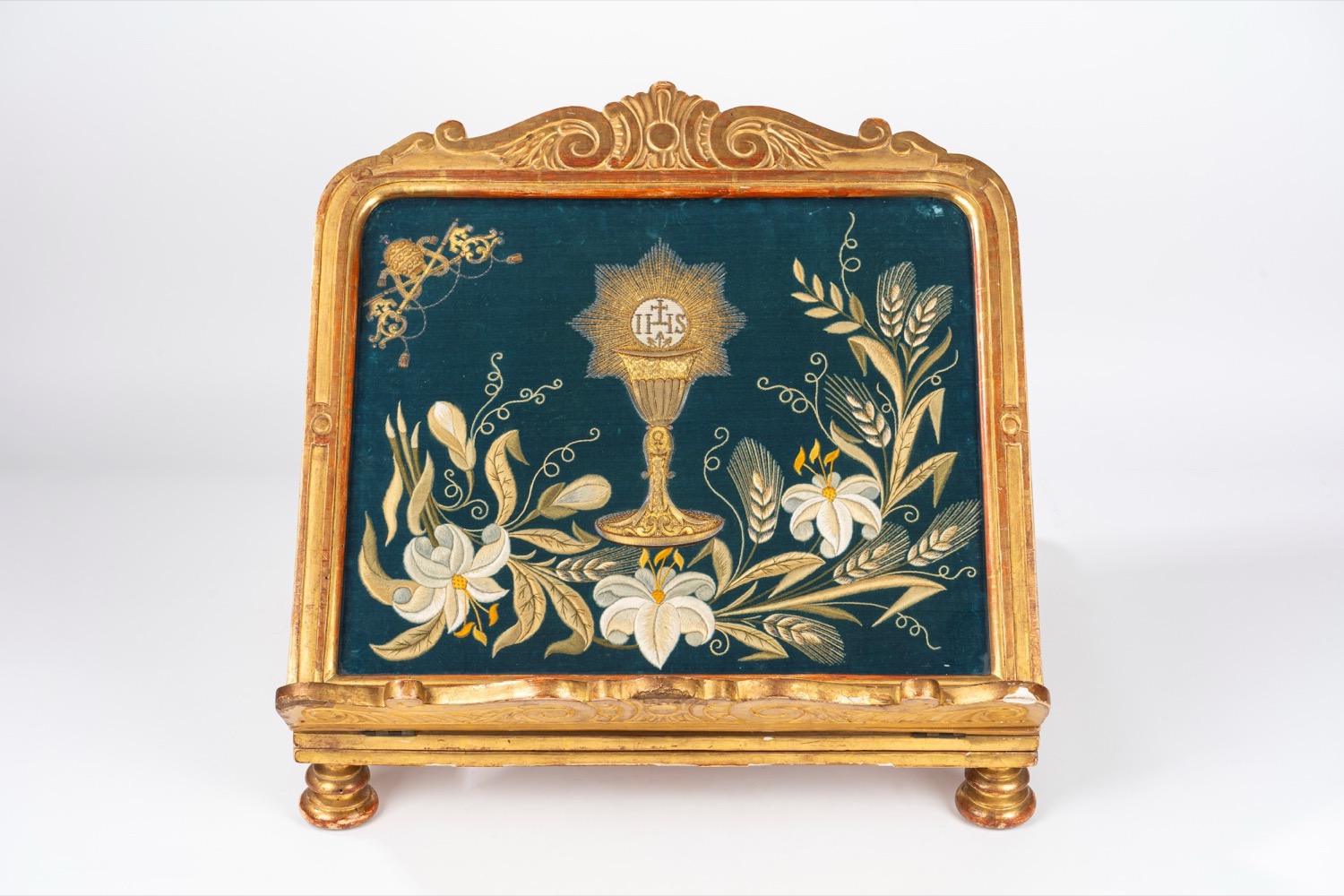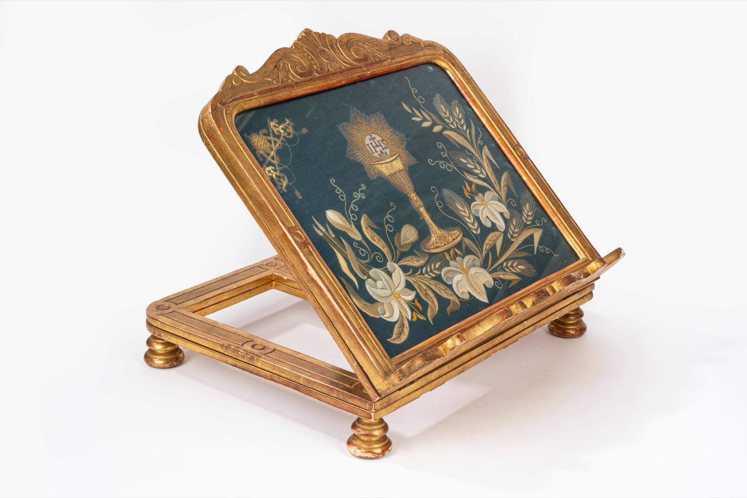 Leggio in legno intagliato e dorato, con all'interno pannello ricamato, secolo XIX