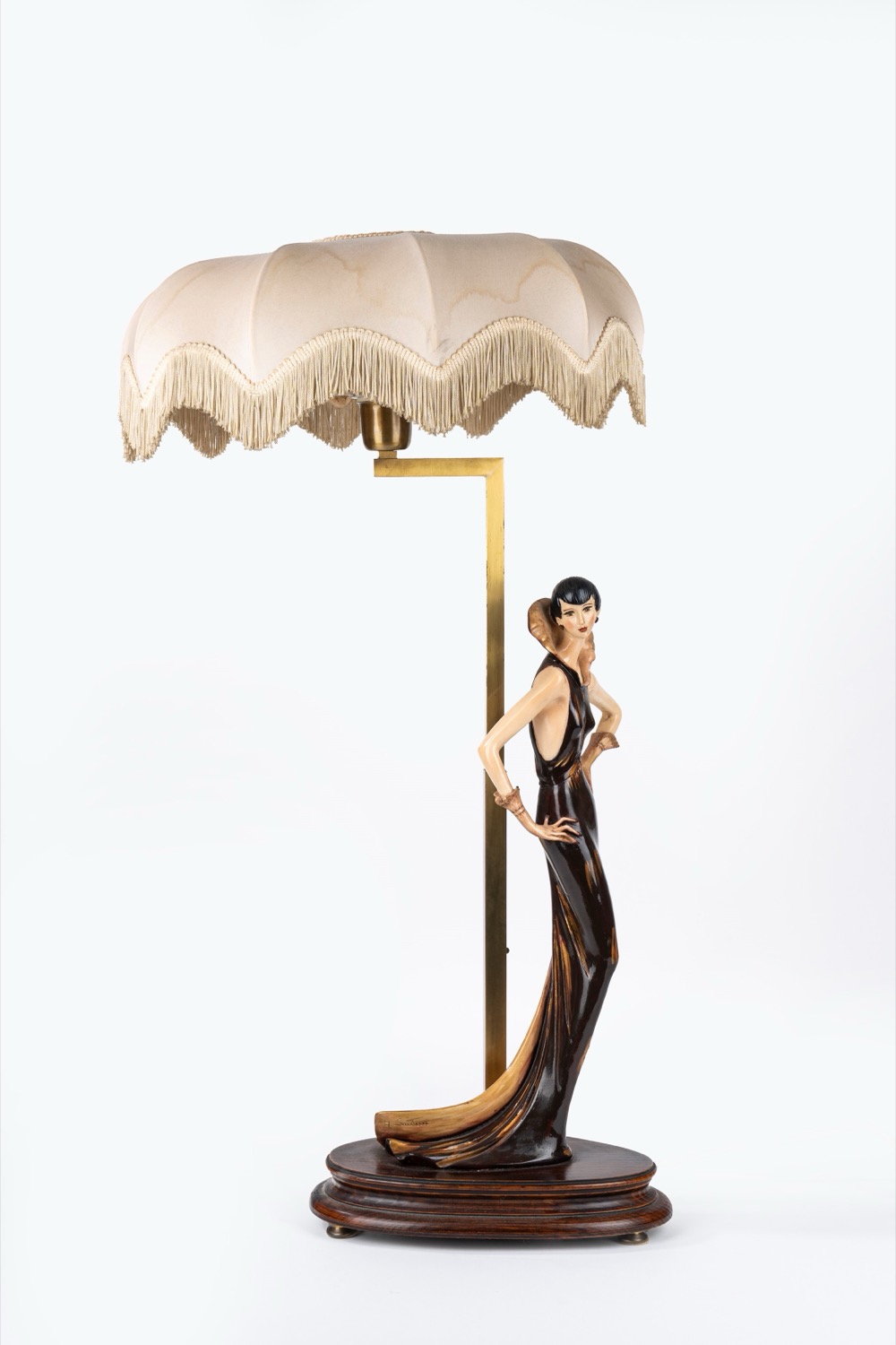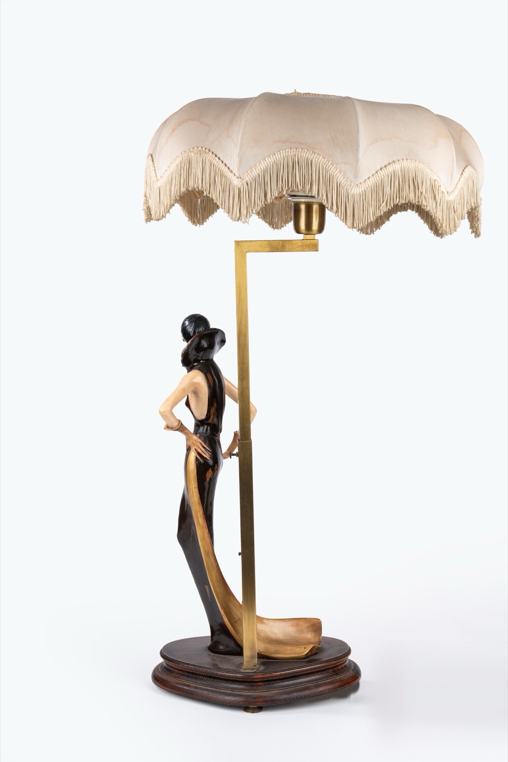 scultura in legno laccato policromo raffigurante giovane donna in abiti anni'30scultura in legno laccato policromo raffigurante giovane donna in abiti anni'30