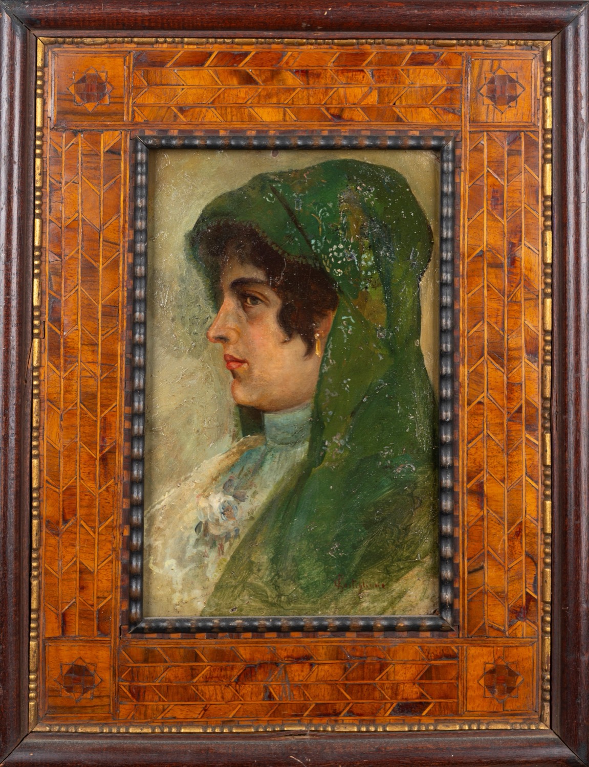 Cornice in legno intarsiato a motivi geometrici, inizi secolo XX