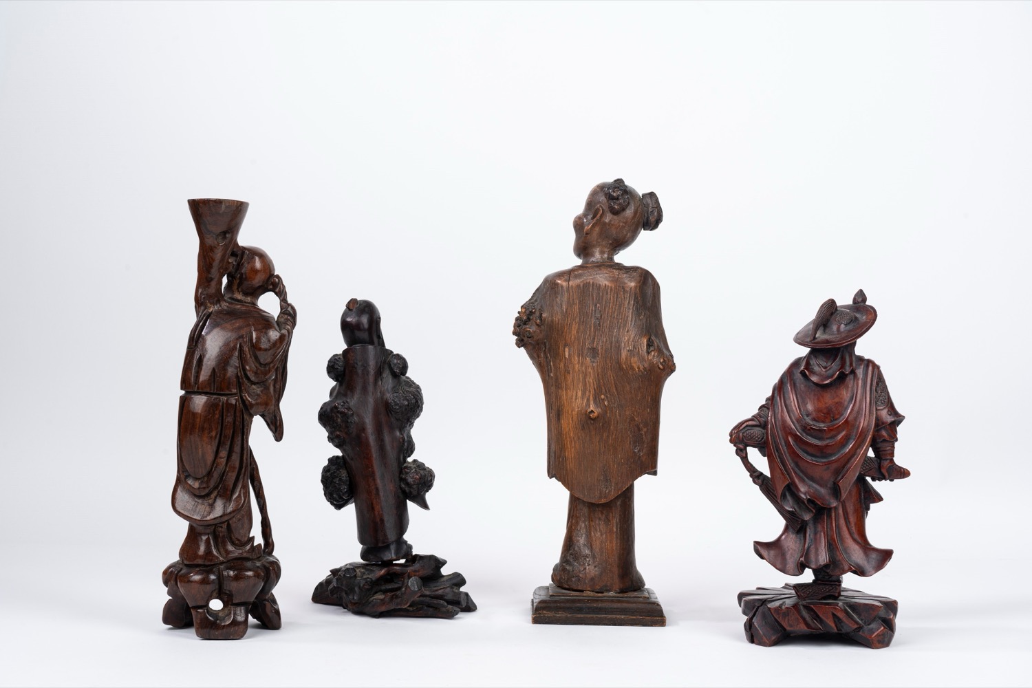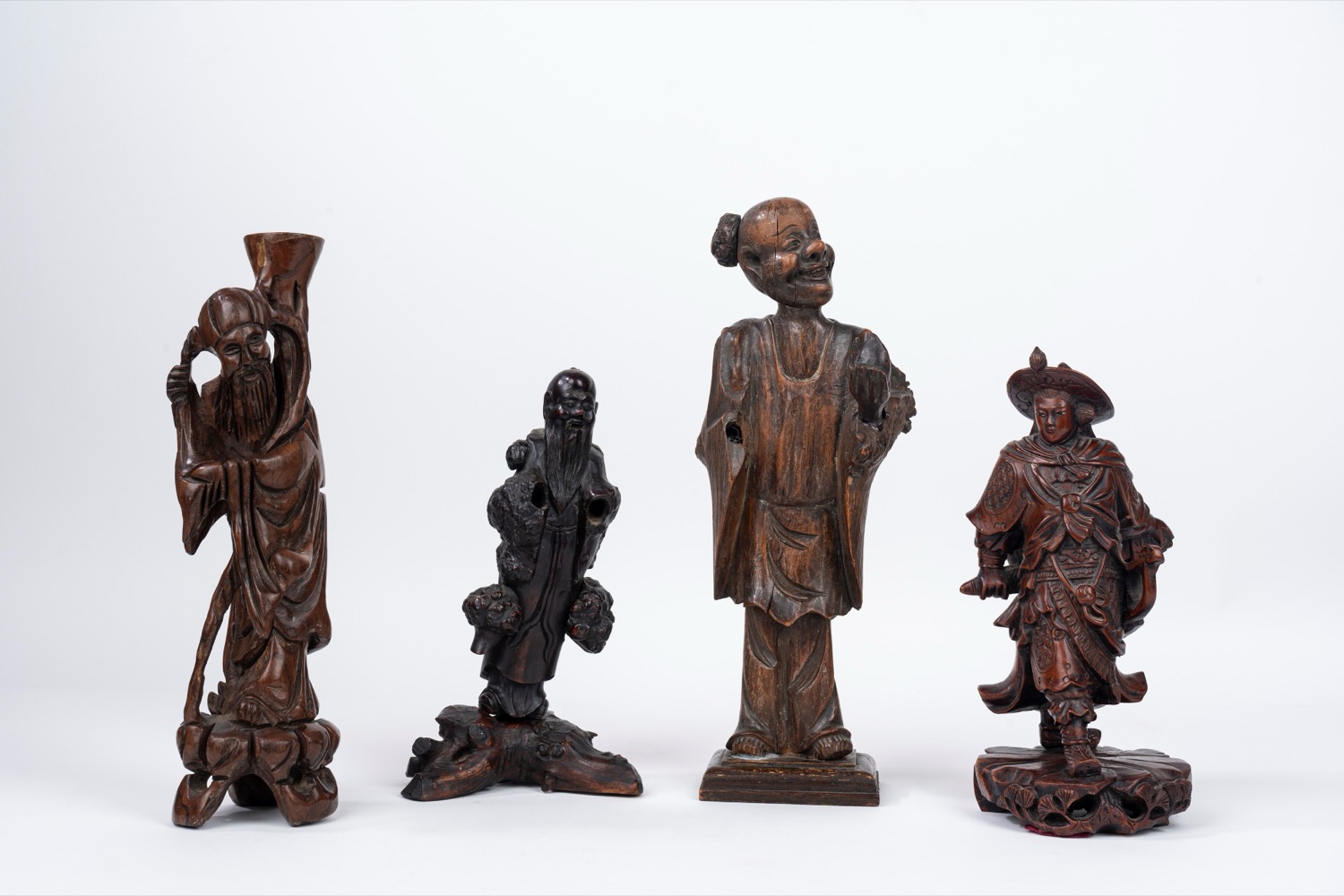 Lotto composto da quattro figure orientali in legno scolpito. Cina, secolo XX