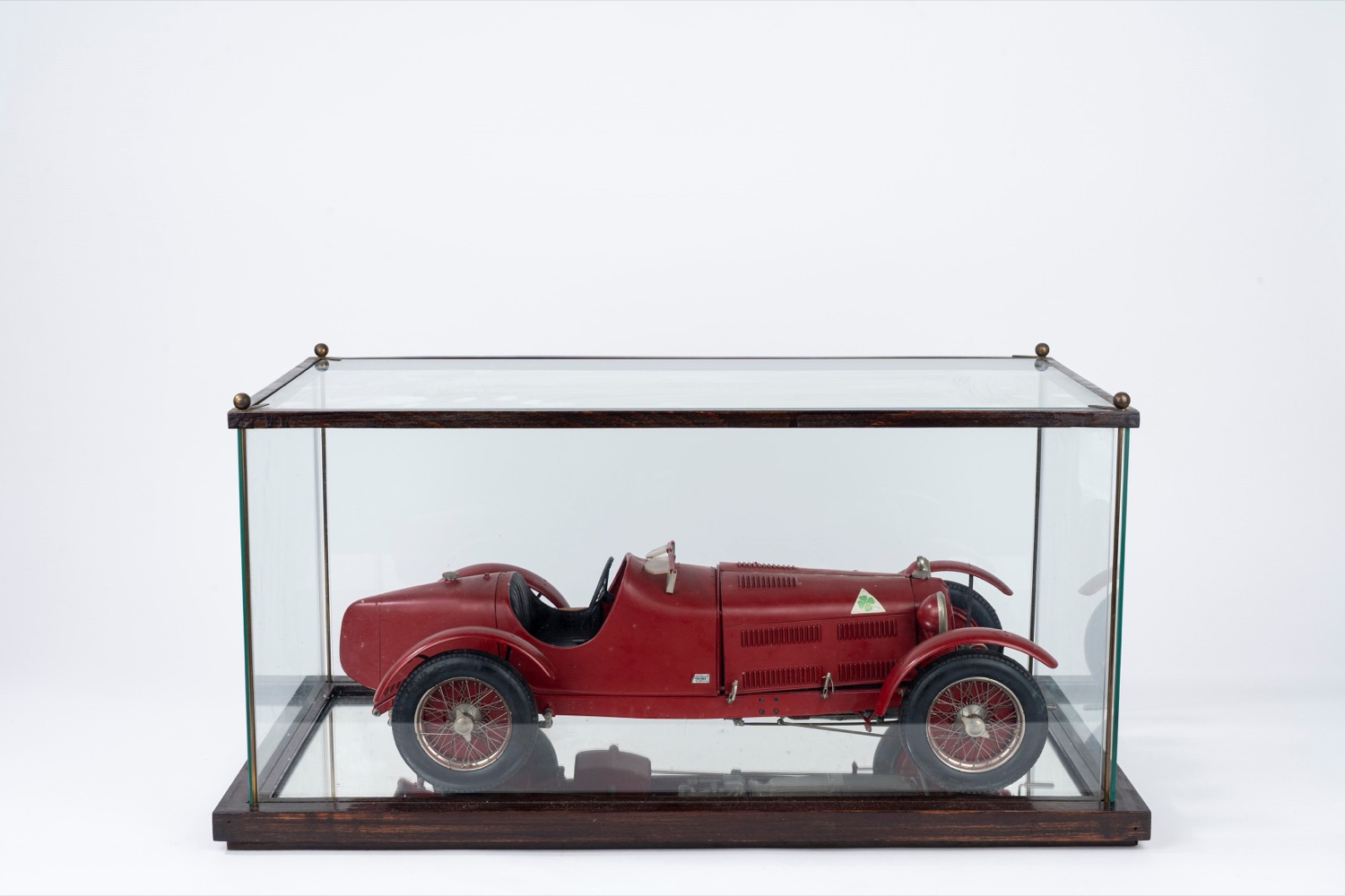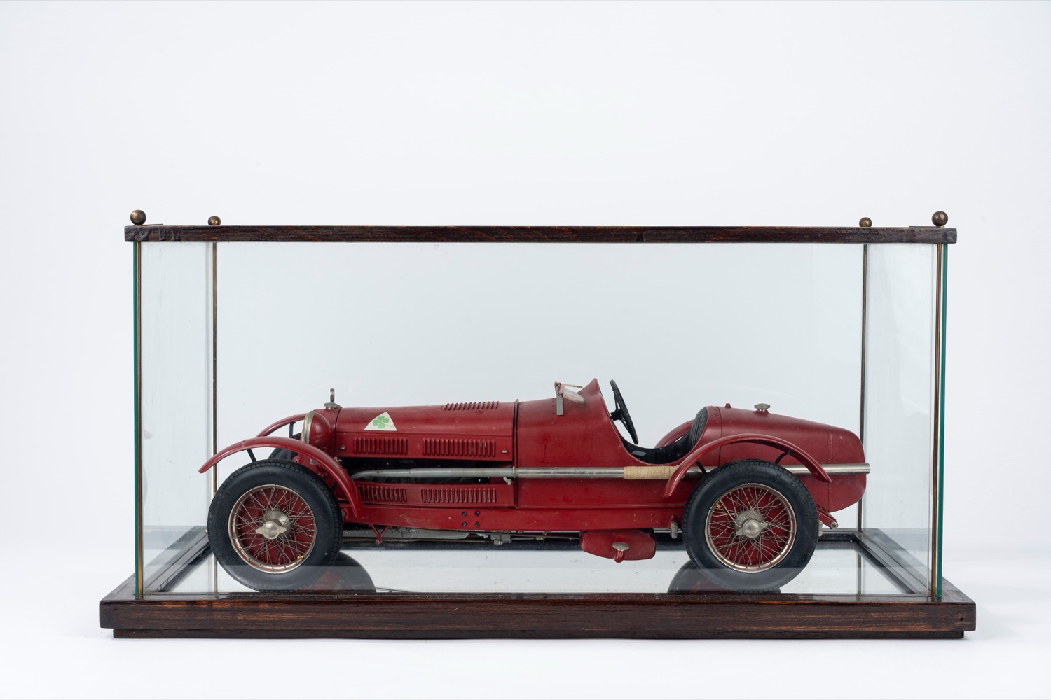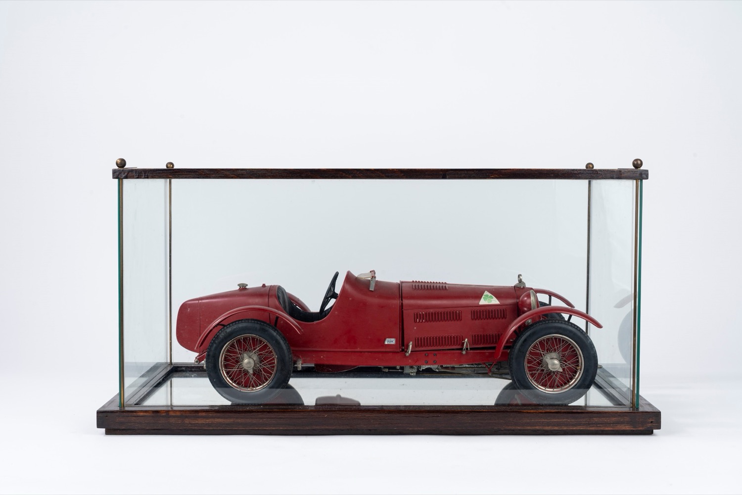 Modello di automobile Alfa Romeo rossa, entro teca in vetro