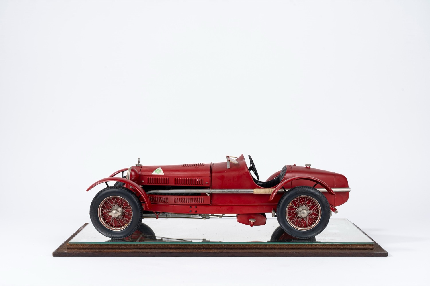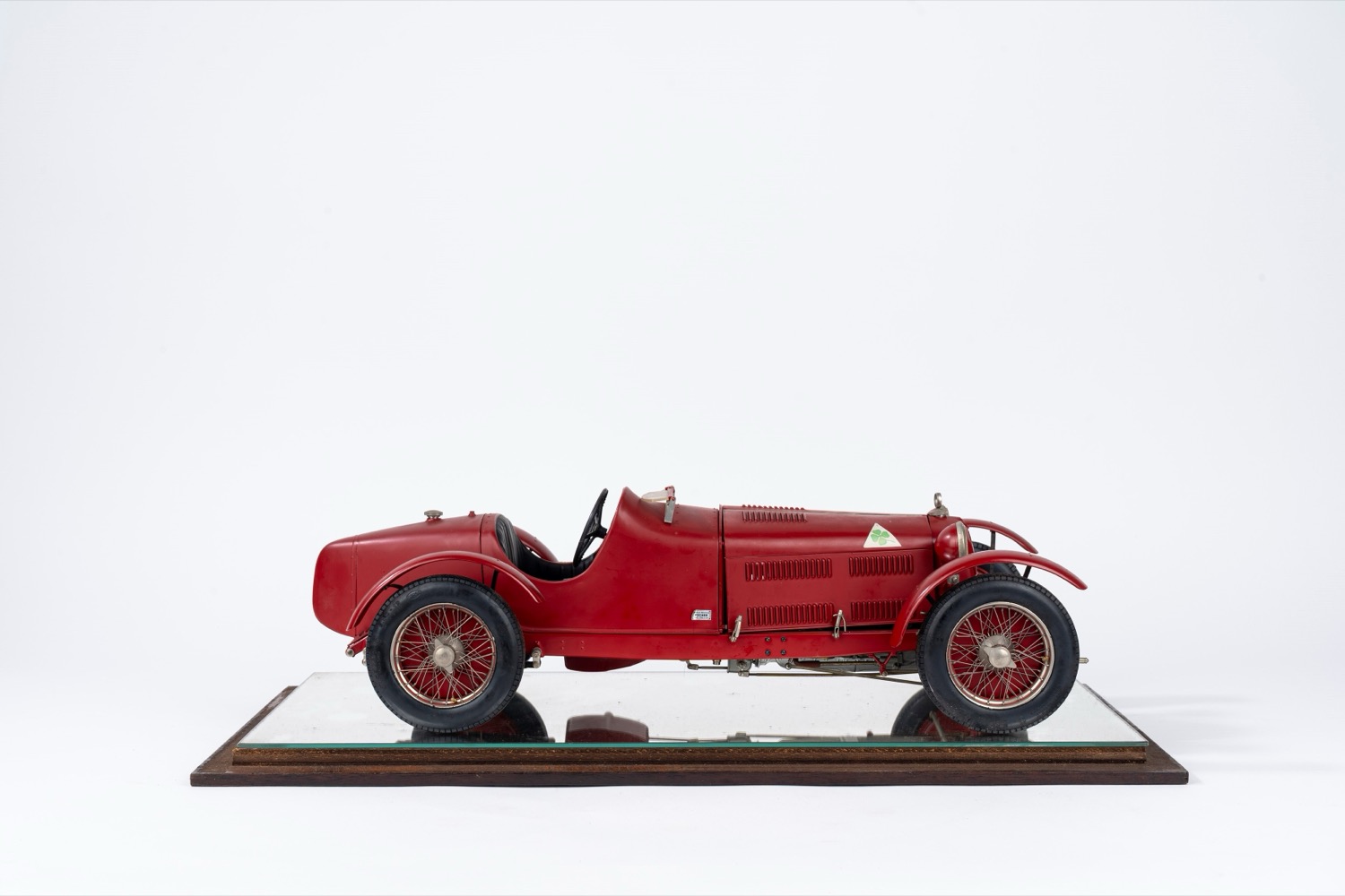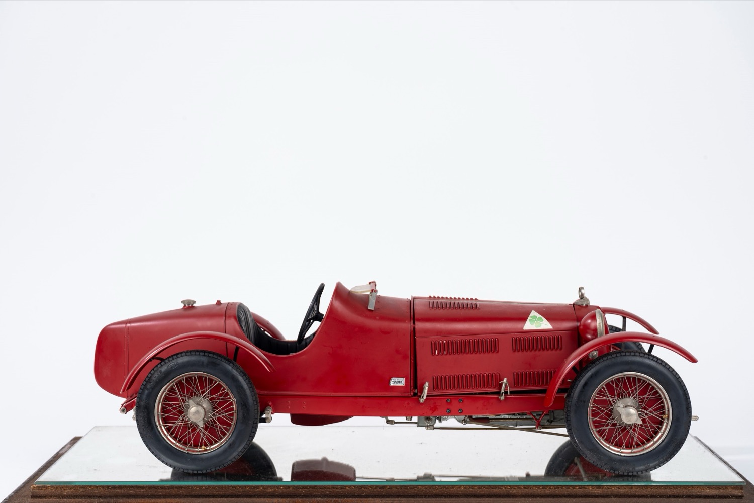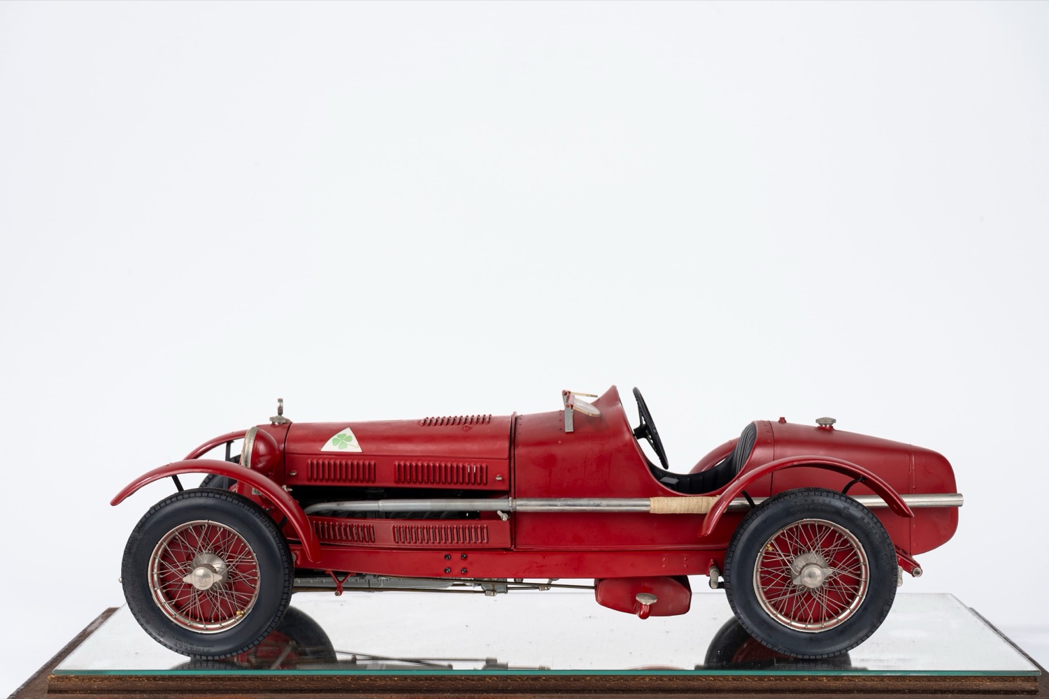 Modello di automobile Alfa Romeo rossa, entro teca in vetro