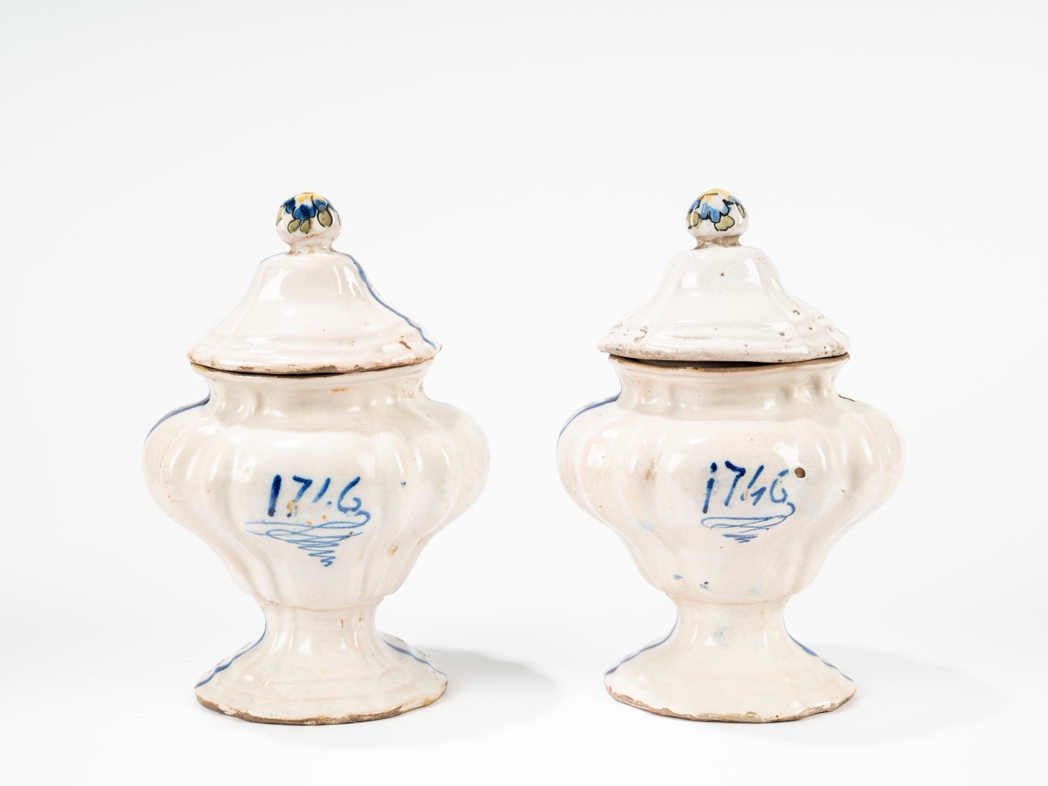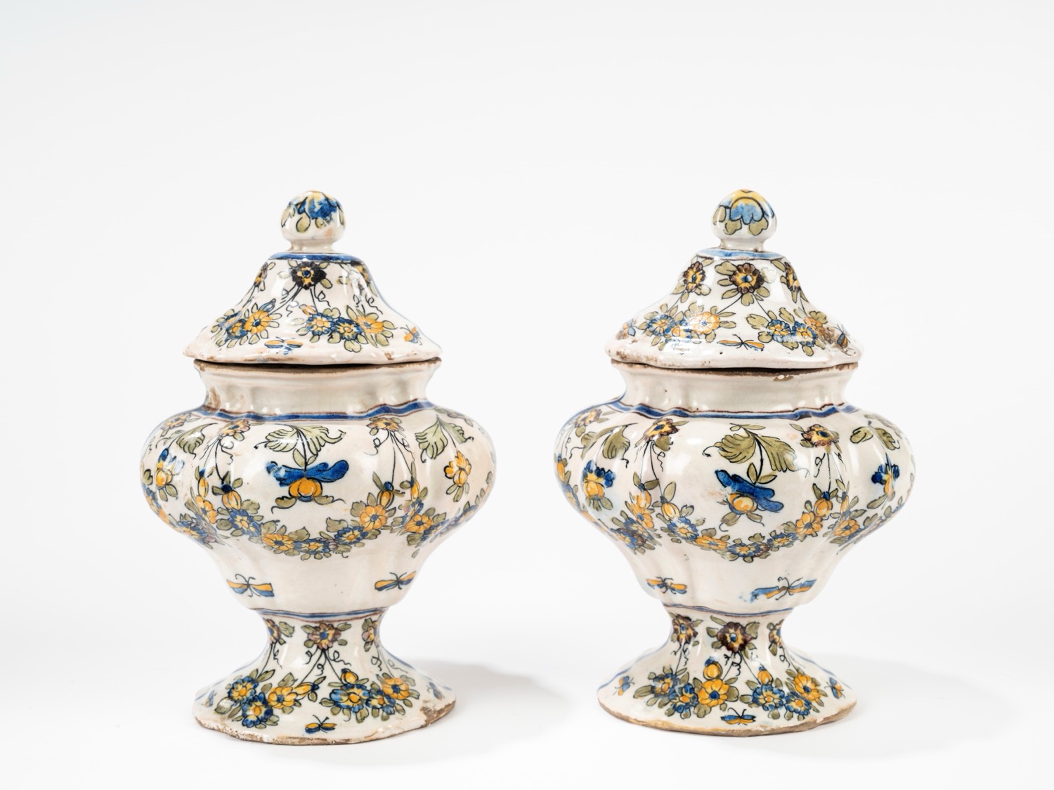 a corpo baccellato a balaustro, piede a profilo mosso, decoro a fiori, foglie e farfalle nei toni del blu, verde e giallo, datati al retro 1746a corpo baccellato a balaustro, piede a profilo mosso, decoro a fiori, foglie e farfalle nei toni del blu, verde e giallo, datati al retro 1746