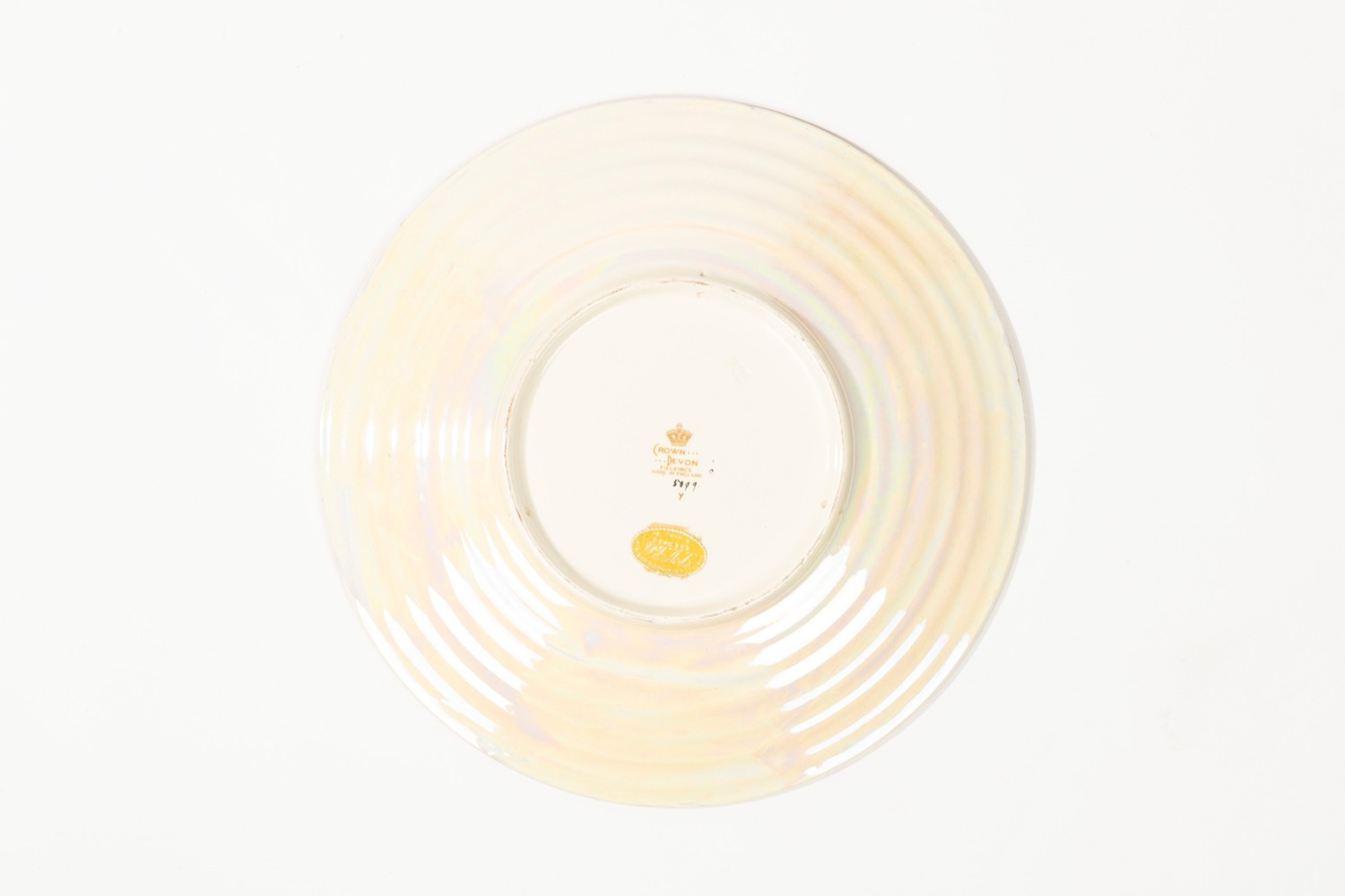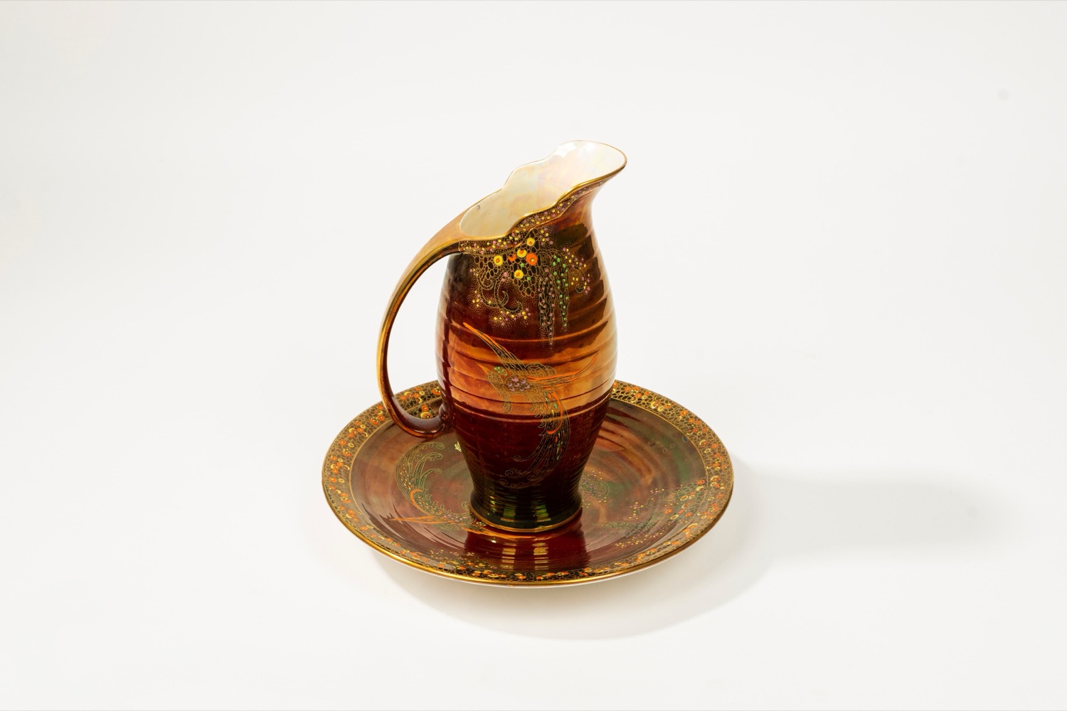 Brocca e piatto in ceramica smaltata policroma a fondo rosso rame, Manifattura Crown Devon, Inghilterra, secolo XX