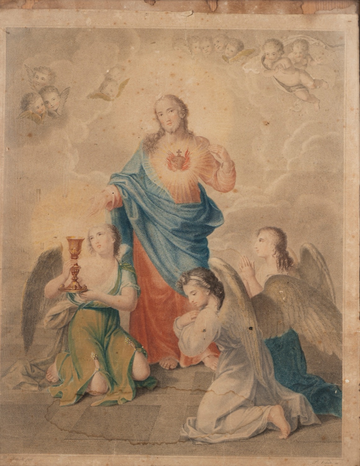 Scuola italiana, secolo XIX - Incisione acquerellata raffigurante Cristo tra gli Angeli
