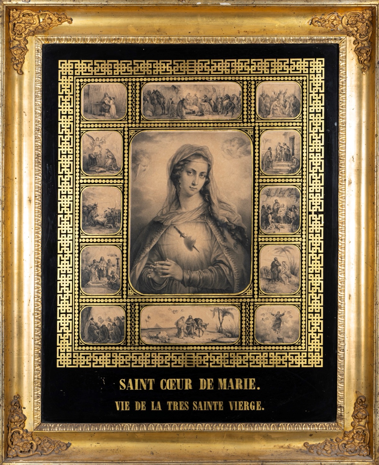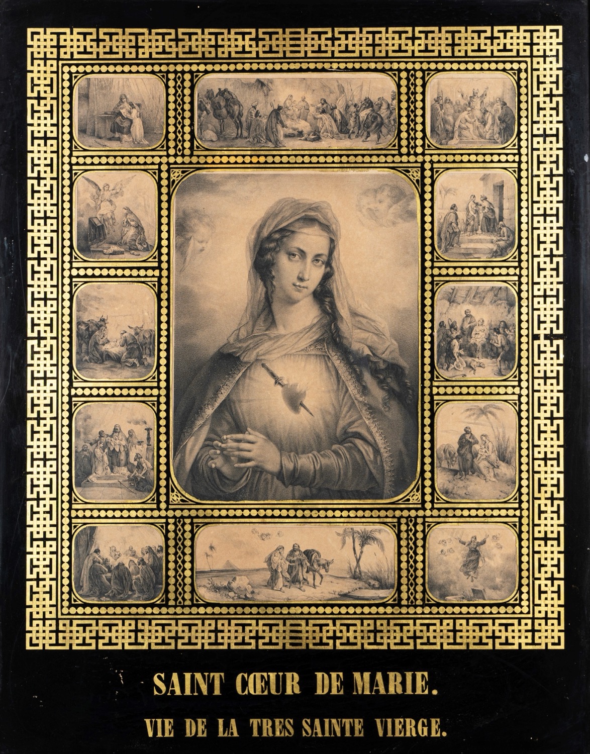 Scuola francese, secolo XIX - Incisione raffigurante il Sacro Cuore di Maria e scene della Vita della Vergine