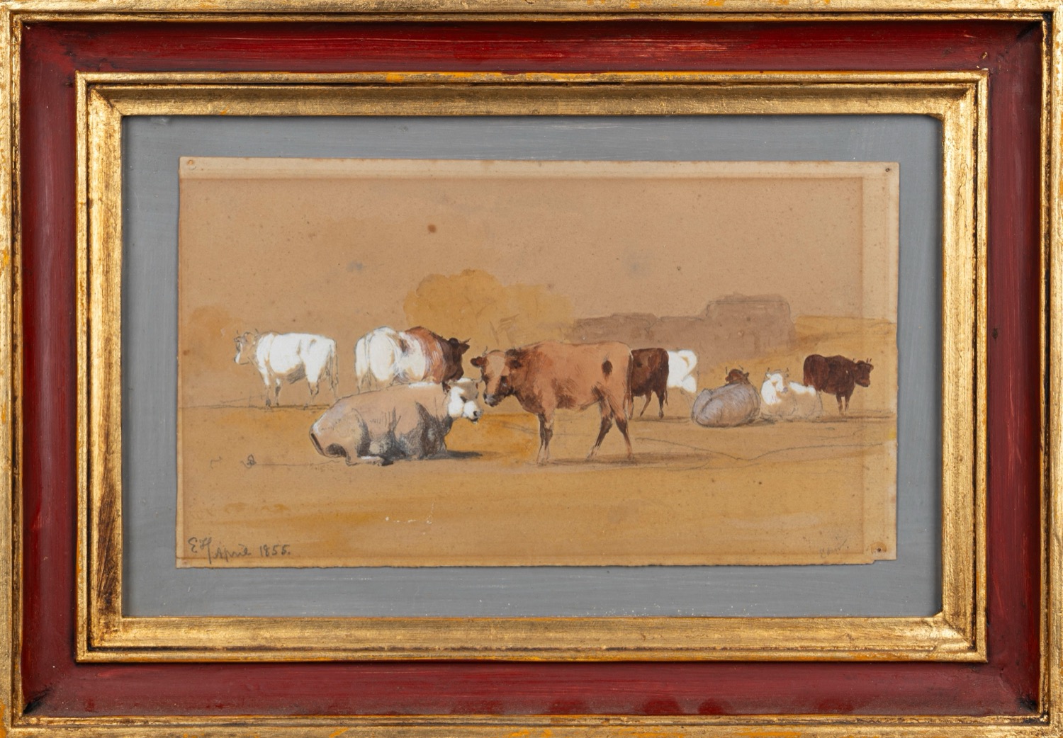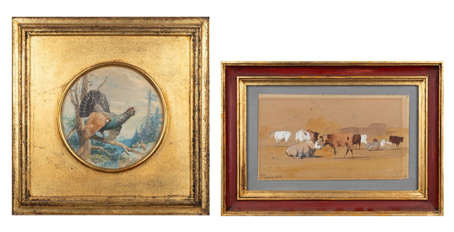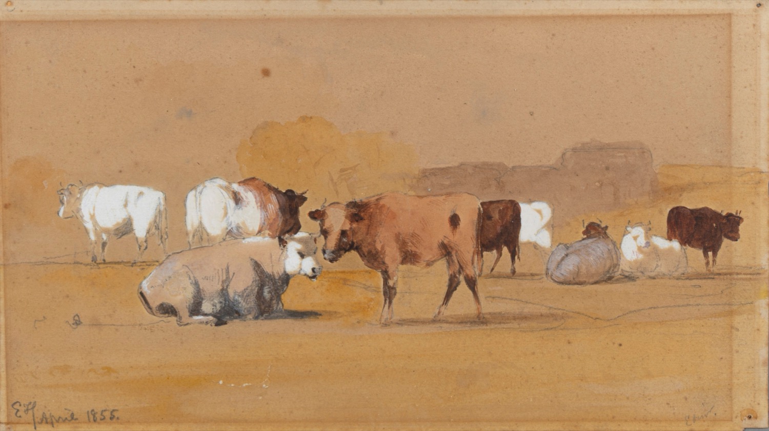 insieme nel lotto, acquerello su carta raffigurante mucche al pascolo, cm 16 x 26, siglato e datato in basso a sinistra: E H April 1855