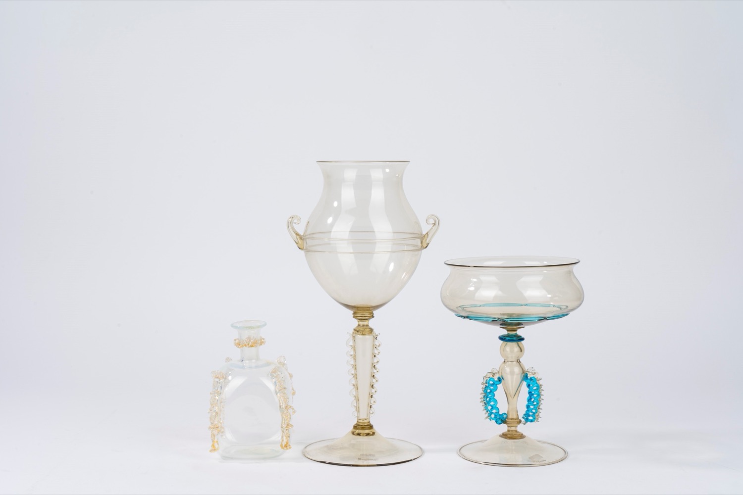 Lotto composto da due bicchieri in vetro di Murano, firmati Seguso, e un flaconcino