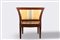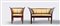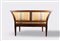 in legno intagliato, divano a due posti e poltroncina con braccioli a lira