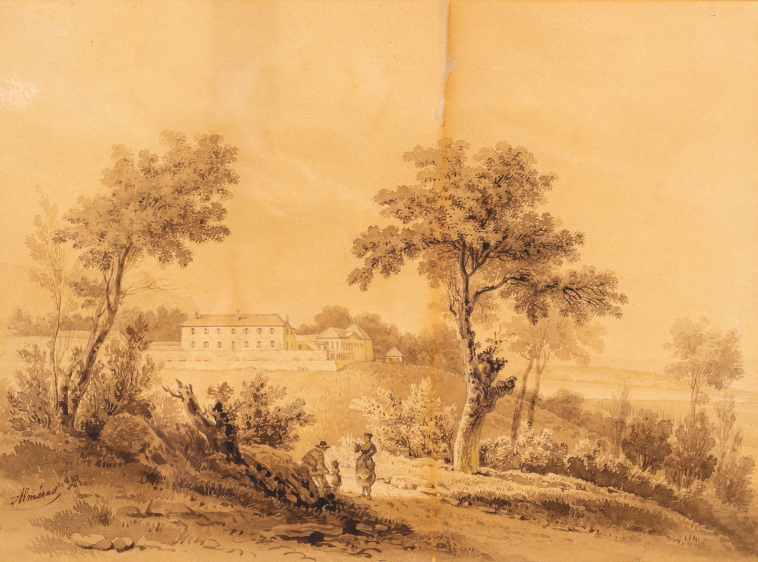Scuola francese, secolo XIX - Paesaggio con casolare e astanti in primo piano