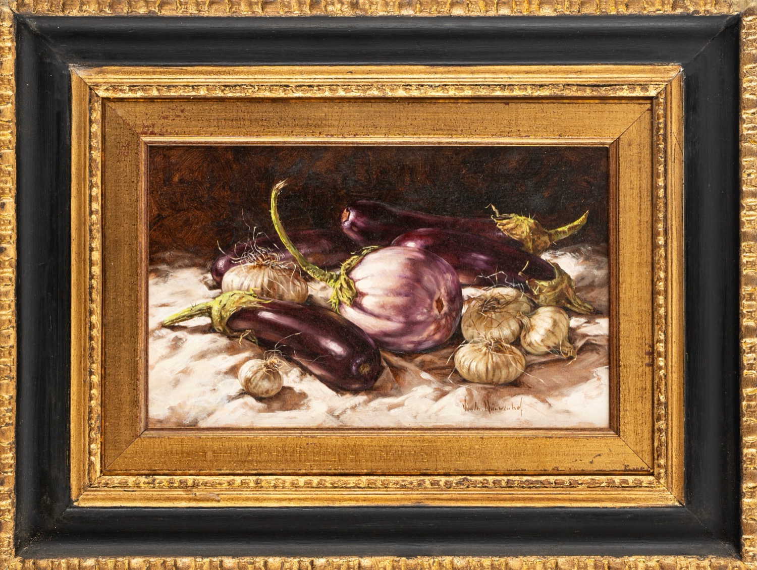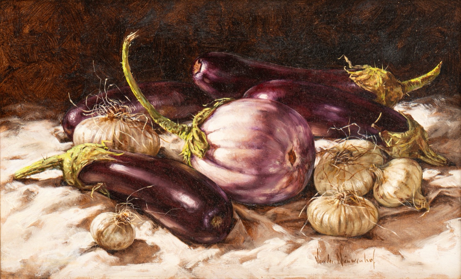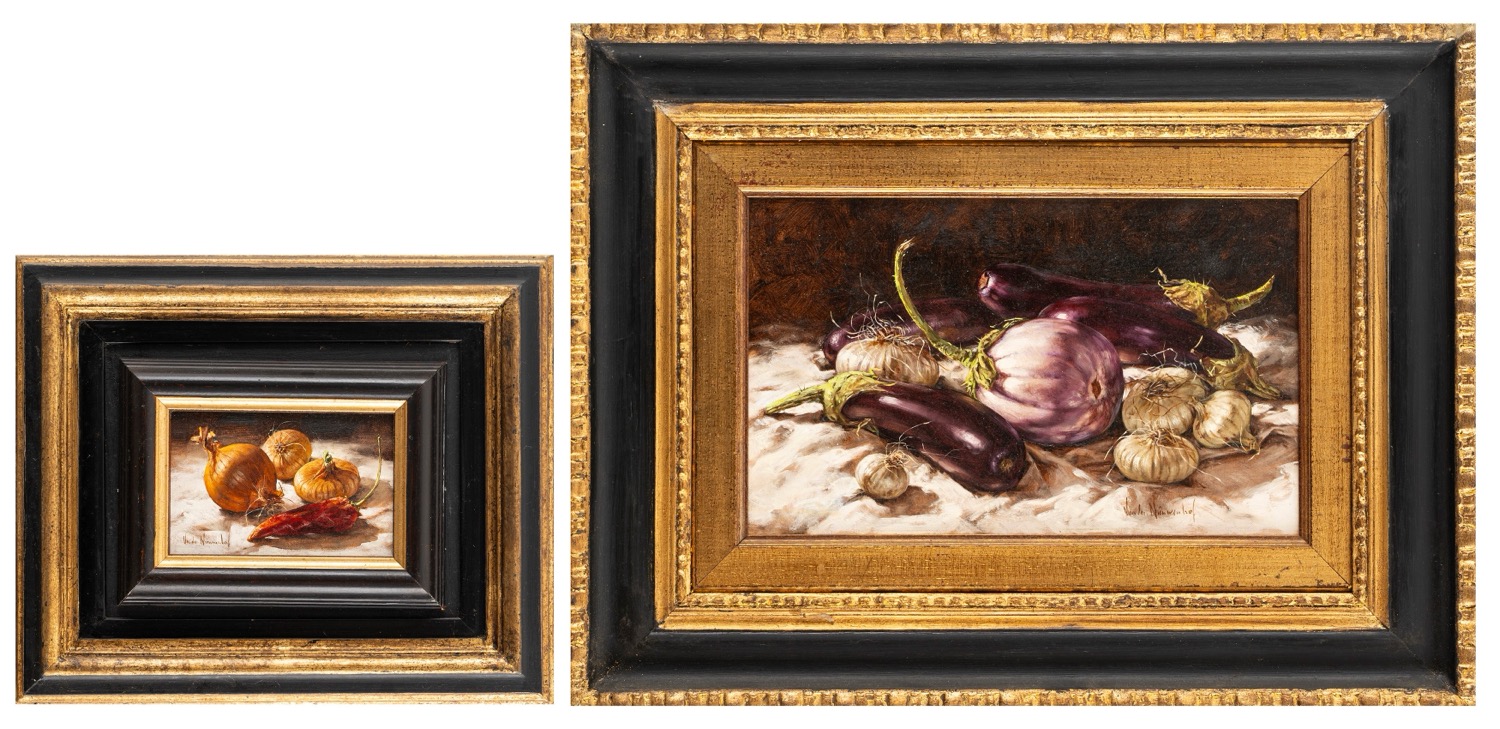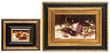 uno con melanzane e cipolle, firmato in basso a destra: Van den Nieuwenhof, l'altro con cipolle e peperoncino, firmato in basso a sinistra: Van den Nieuwenhof