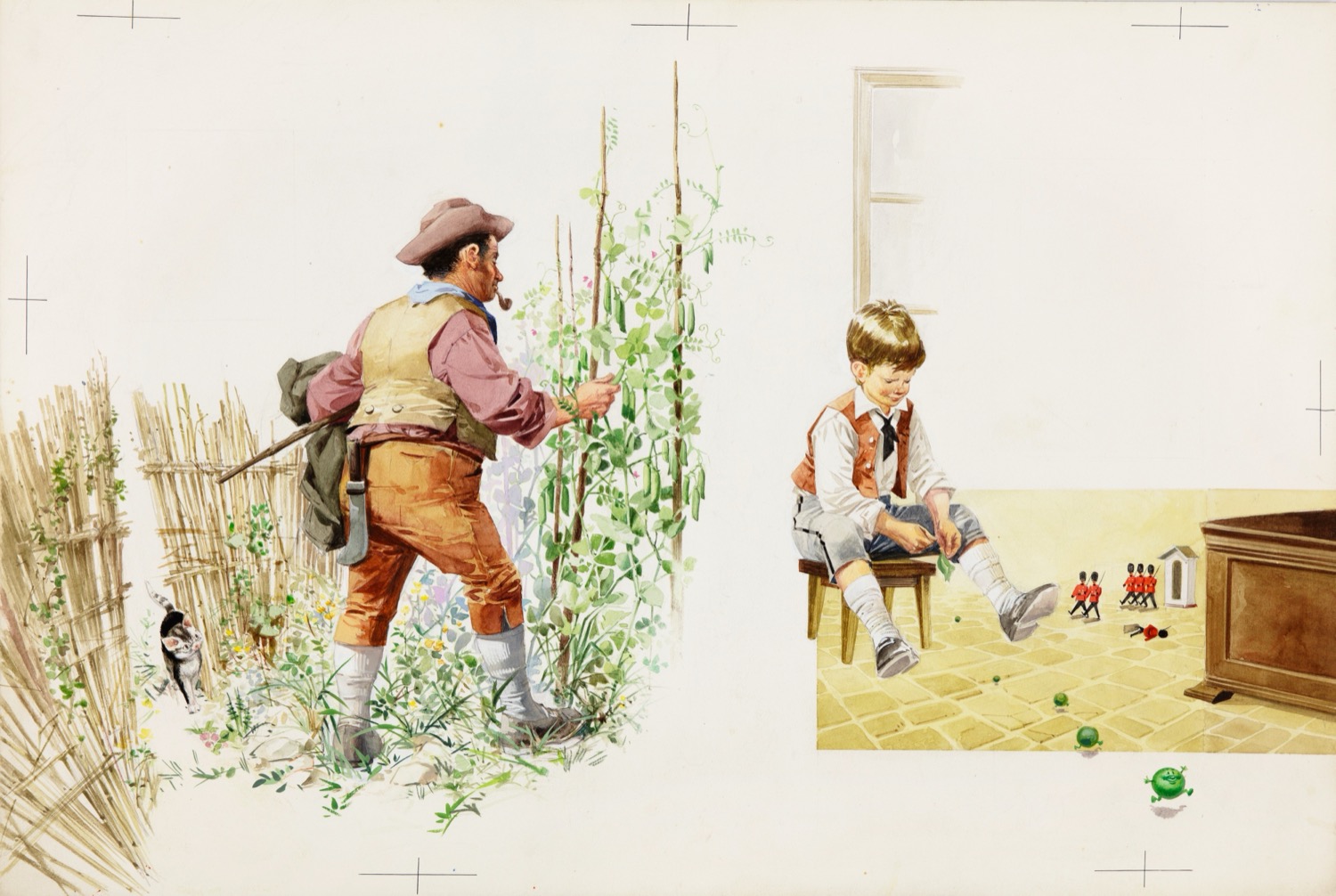 Illustrazione originale realizzata da Bioletto per la fiaba "Cinque in un baccello" edita nel 1967. Lievi pieghe agli angoli inferiori.