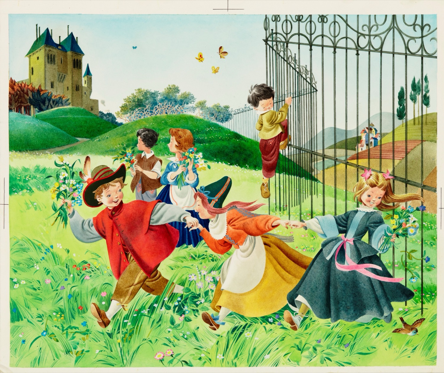 Illustrazione originale realizzata da Lupatelli per il volume "Dodici racconti meravigliosi della Regina Fabiola" edito nel 1964. Lieve piega all'angolo inferiore sinistro.