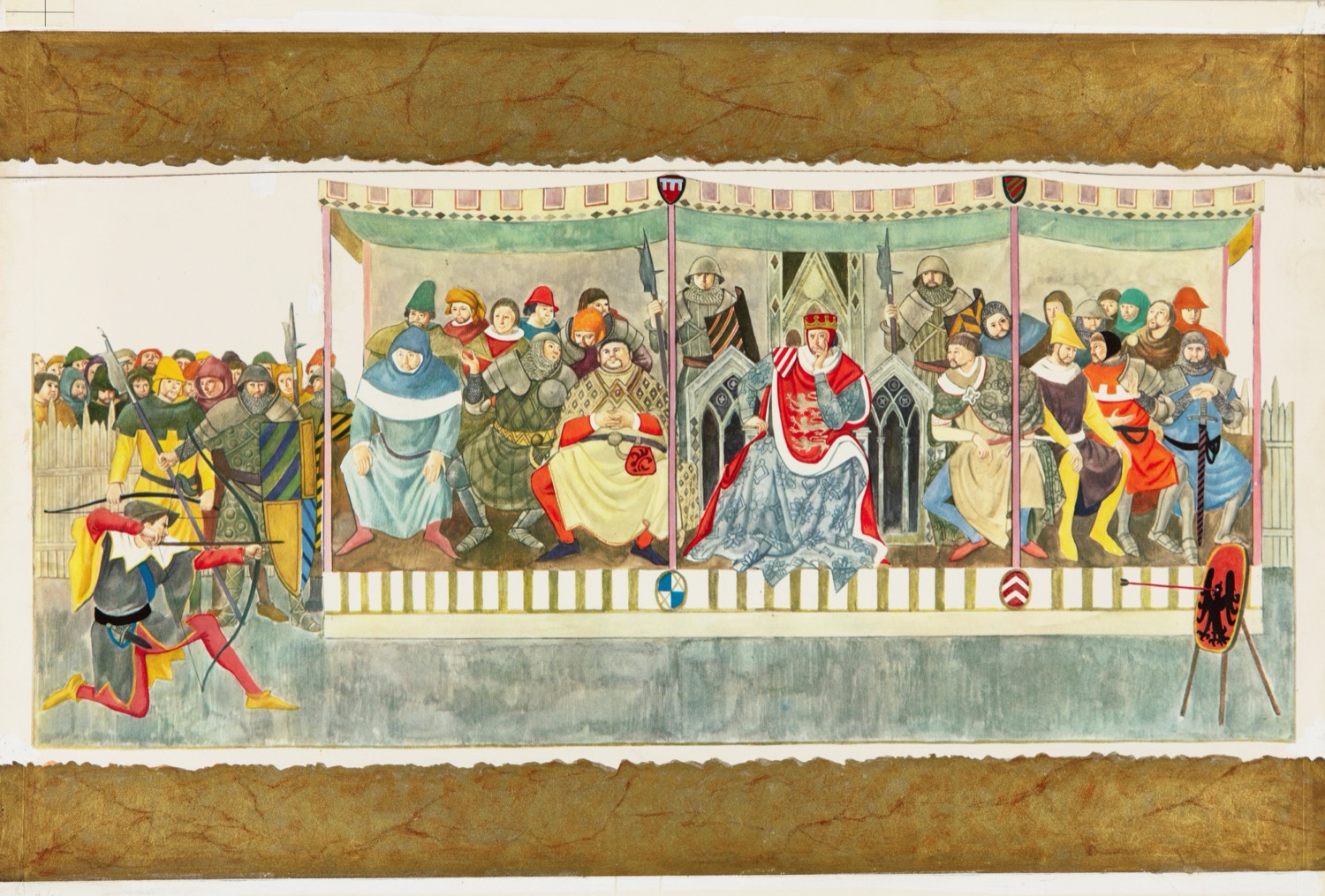 Illustrazione originale realizzata da Benvenuti per il romanzo "Robin Hood" di Alexandre Dumas edito nel 1961. Su due pannelli.