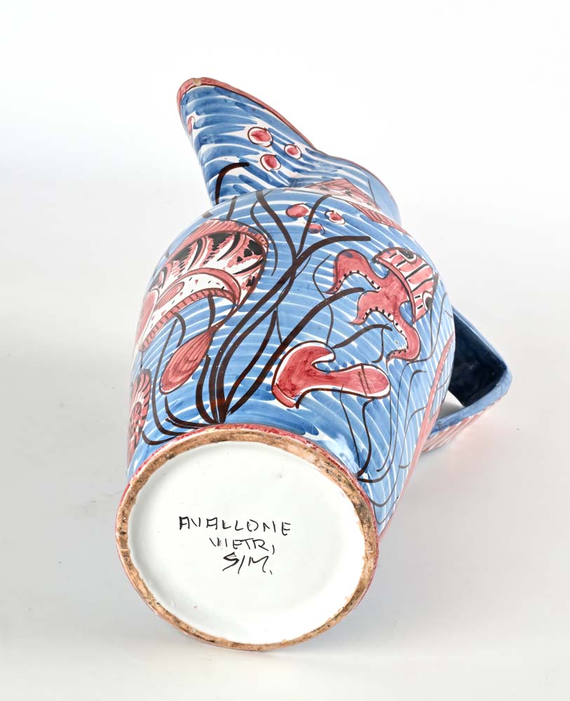 Grande versatoio in ceramica smaltata policroma, manifattura Avallone, Vietri sul mare La vivace decorazione ritrae un paesaggio del fondo del mare popolato di pesci, polpi e coralli nei toni del rosso, dell'azzurro e del bianco. Sotto la base reca firma "Avallone Vietri S/M" cm h 40x30 circa