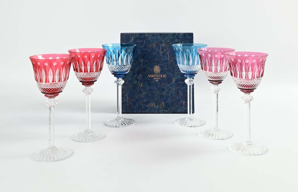 Lotto di 6 bicchieri Saint Louis in cristallo Ogni bicchiere misura cm h 20x9 Ø. I sei bicchieri sono contenuti, nelle tre scatole originali. In ogni scatola ci sono quindi due bicchieri ed il certificato di autenticità. Due sono nei toni dell'azzurro, quattro nei torni del rosa.