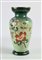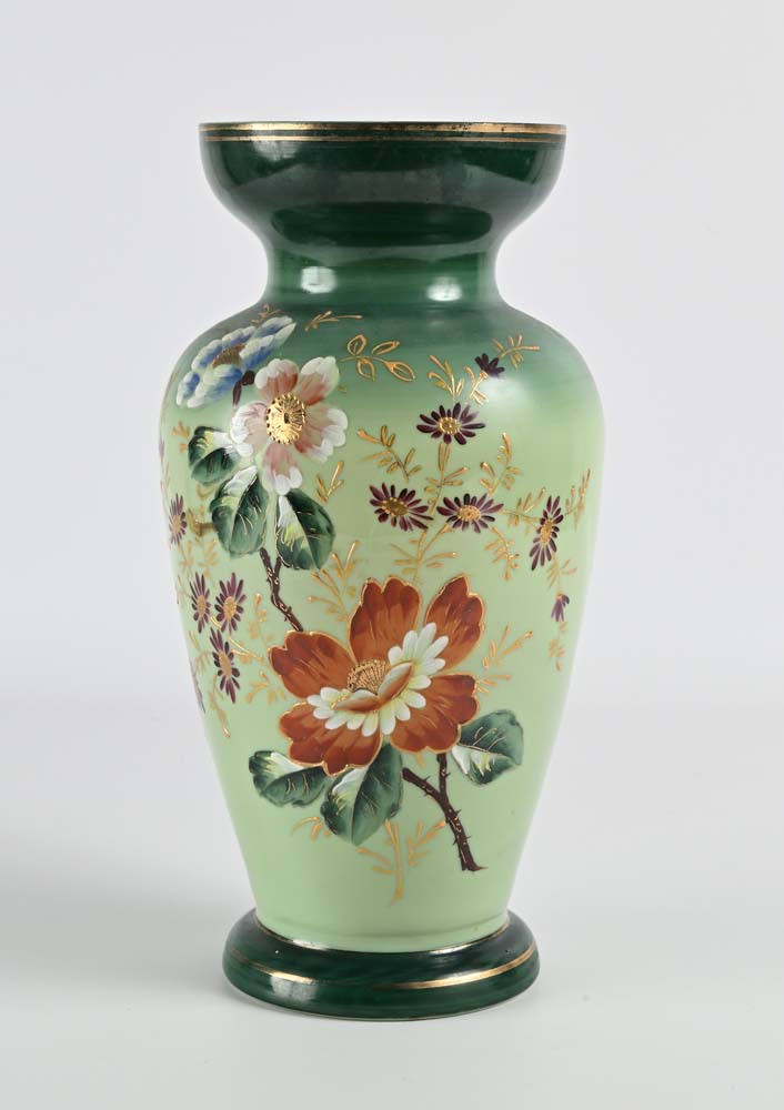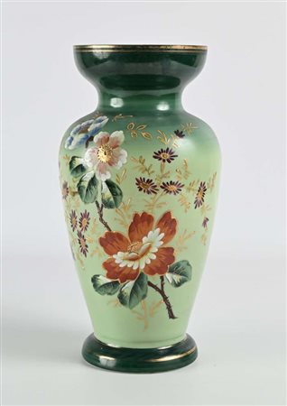 Vaso in vetro verde, inizi XX secolo decorato da grandi composizioni floreali dipinte in vivace policromia con lumeggiature dorate su fondo verde altezza cm 37,5