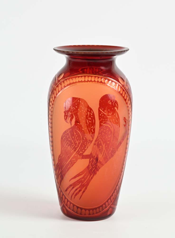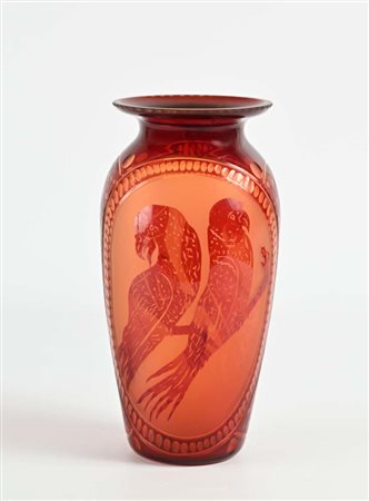Vaso in vetro rosso, XX secolo con decorazione incisa all'acido a raffigurare uccelli altezza cm 32