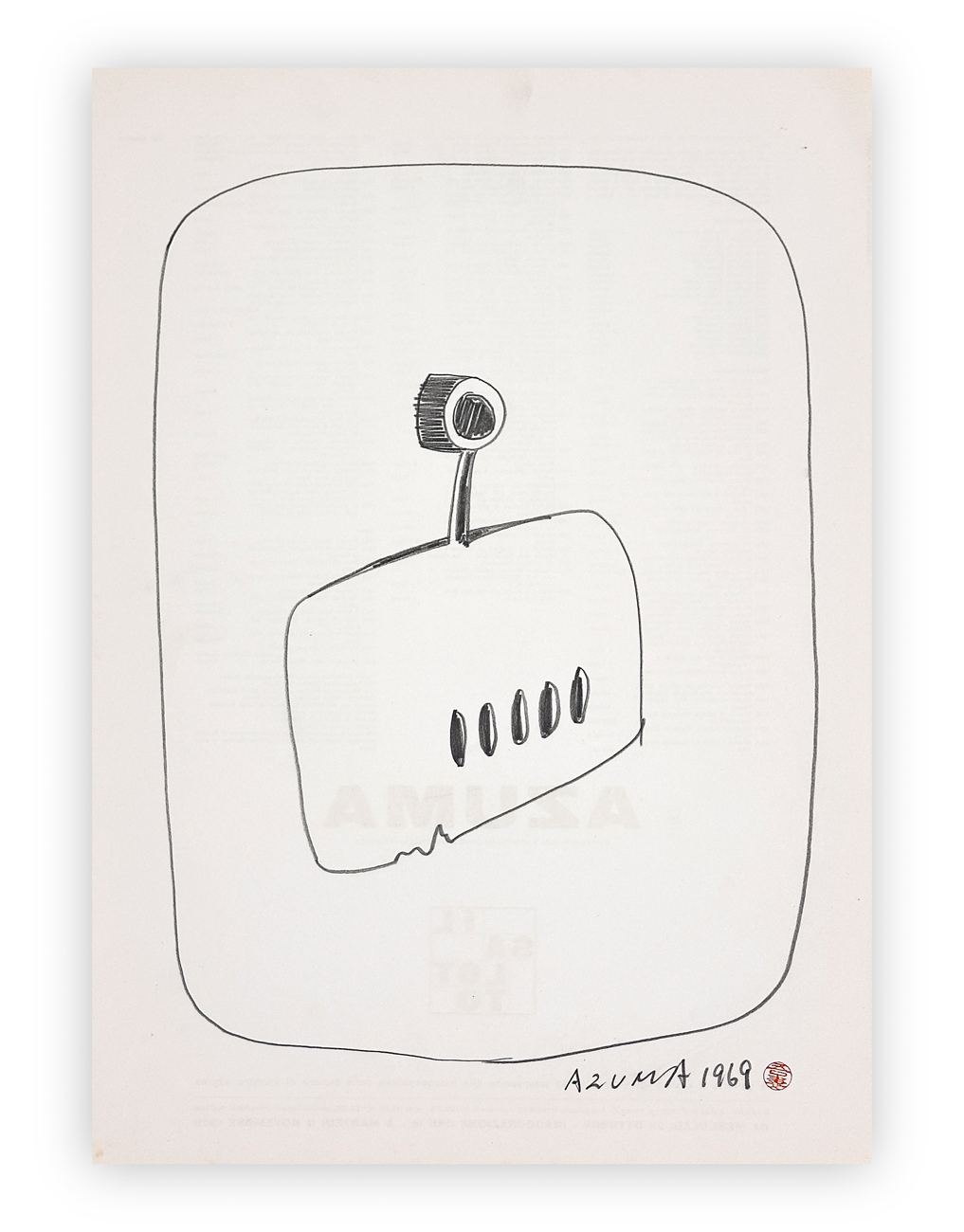 L'opera è realizzata sul retro dell'invito all'inaugurazione dell'esposizione 'Azuma' tenutasi presso la Galleria Il Salotto, Como, il 11/11/1969 (il disegno è un originale unico quale omaggio dell'Artista)