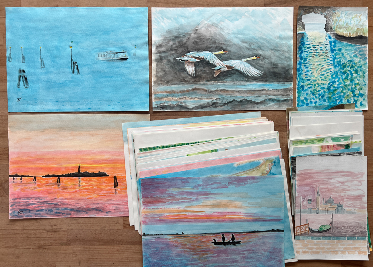 Lotto unico di 66 acquerelli su carta, perlopiù raffiguranti scorci veneziani, paesaggistici e floreali, perlopiù recanti firma indecifrata e datazione (1984/1985) al fronte e titolo e datazione al retro