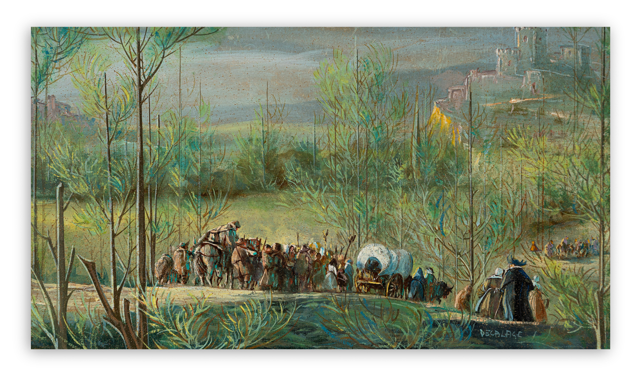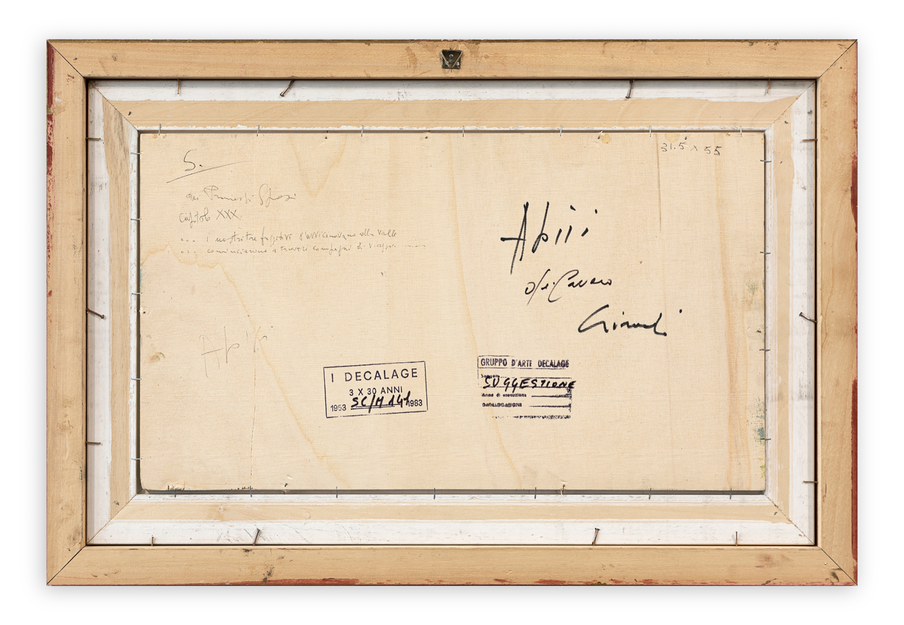 Timbri del Gruppo d'Arte Decalage e firme degli artisti partecipanti (Nardo Girardi, Felix de' Cavero, Attilio Aloisi) al retro