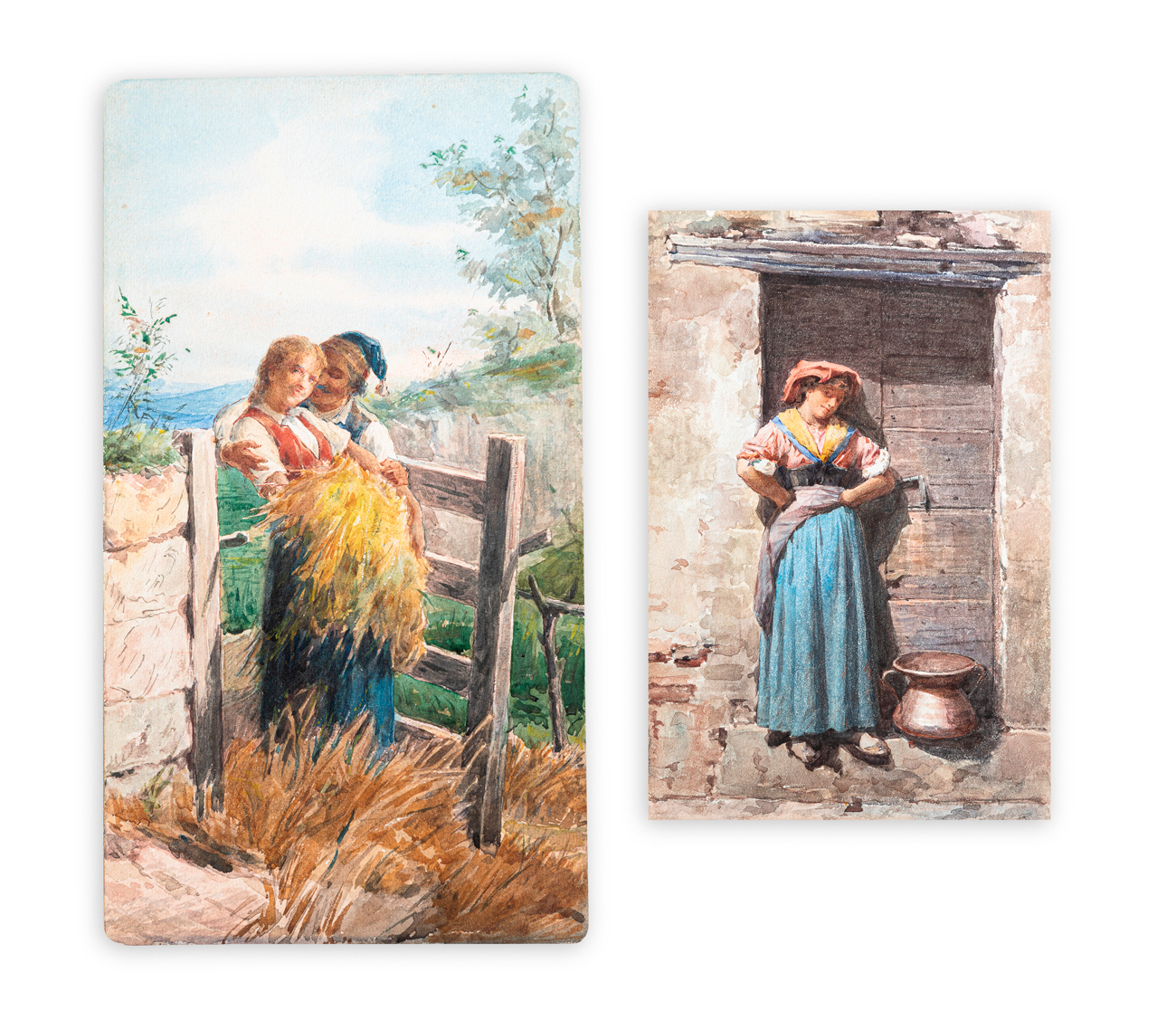 Lotto unico di 2 opere ad acquerello su cartone raffiguranti popolani
