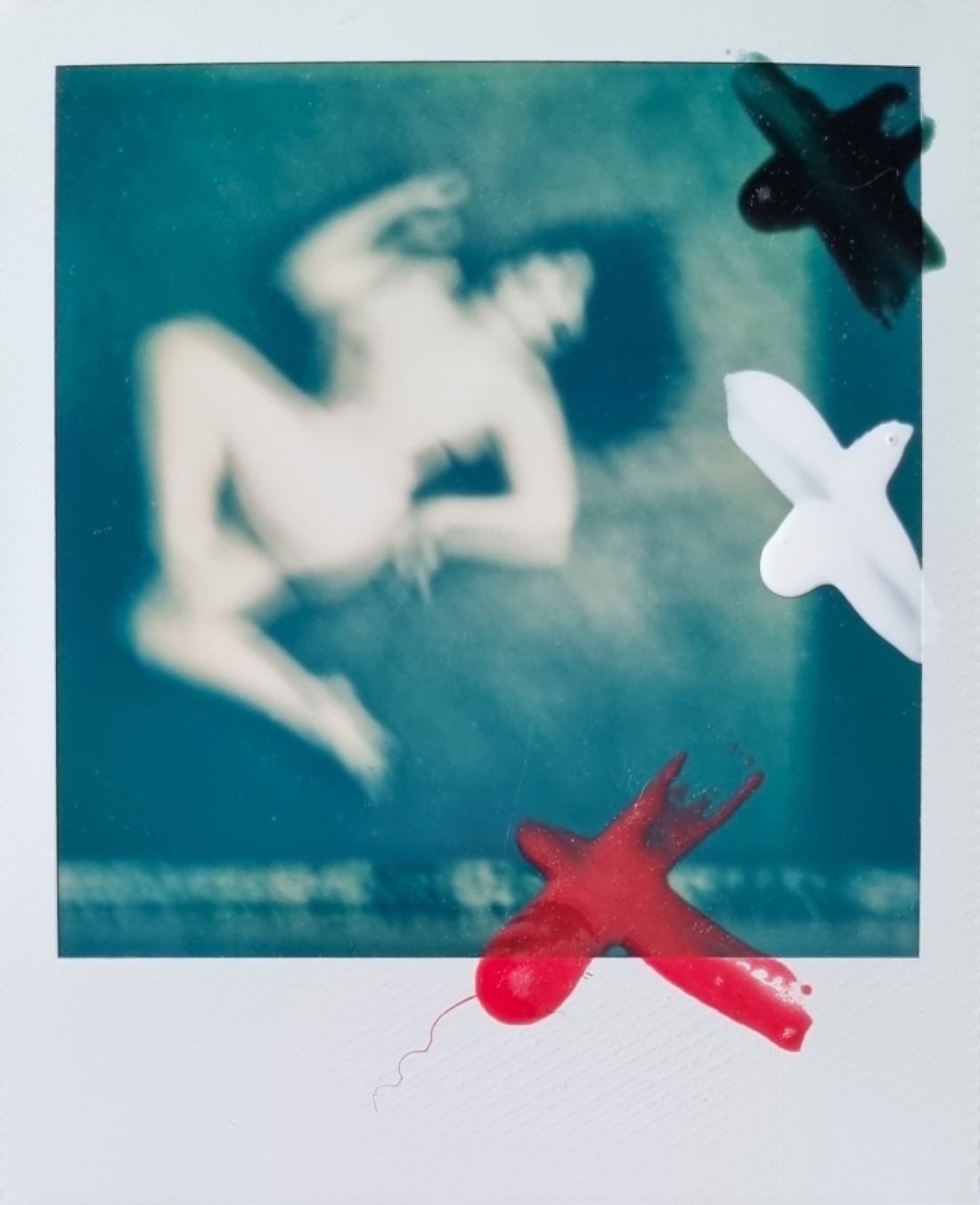 DE FEUDIS SEBASTIANO Foggia 1960 "Senza titolo" Tecnica mista e applicazioni in cera persa su Polaroid film B.V. cm 8,9x10,9. Firmata al verso.